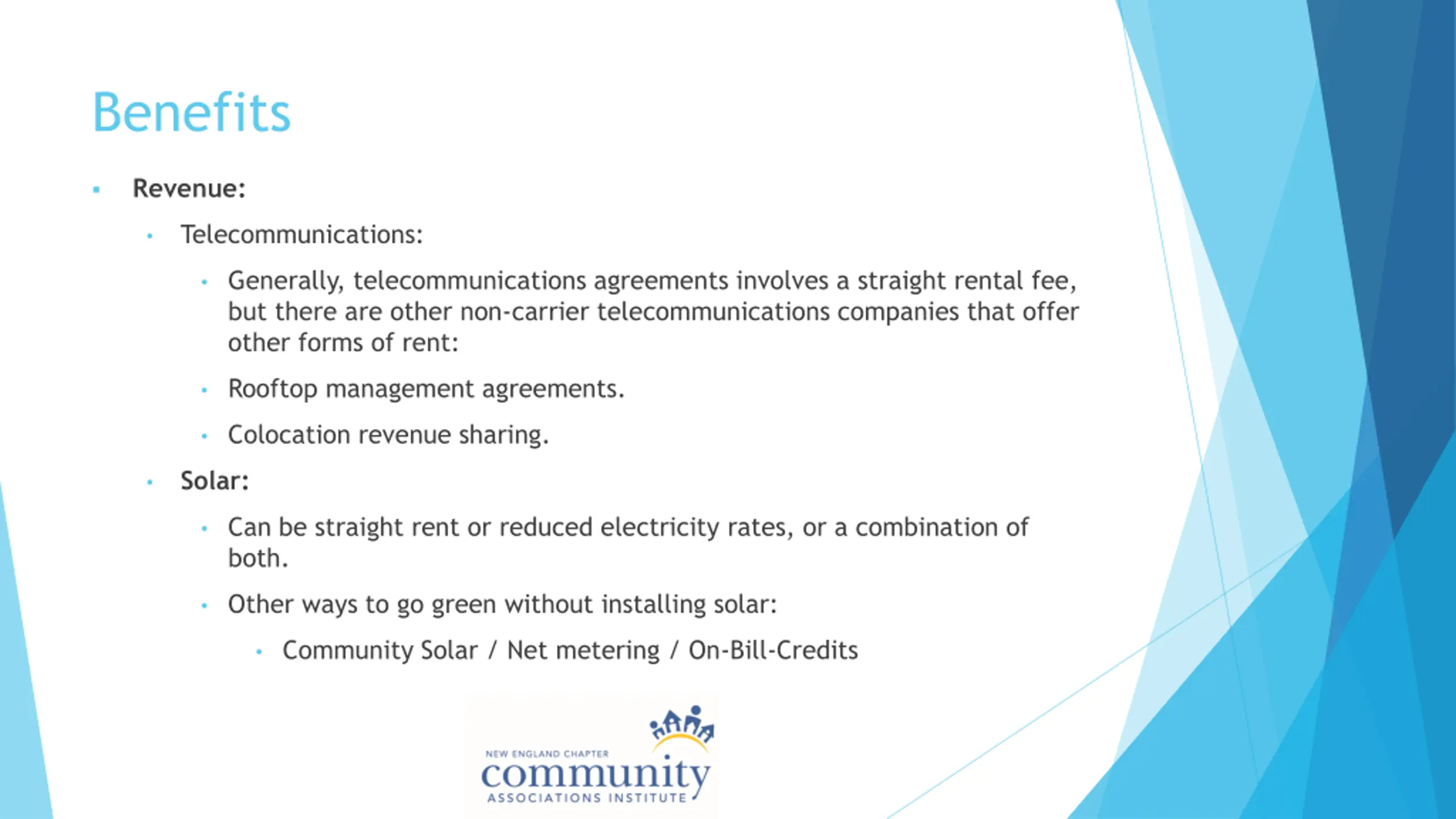 Benefits Revenue: Telecommunications: Generally, telecommunications agreements involves a straight rental fee, but there are other non-carrier telecommunications companies that offer other forms of rent: Rooftop management agreements. Colocation revenue sharing. Solar: Can be straight rent or reduced electricity rates, or a combination of both. Other ways to go green without installing solar: Community Solar / Net metering / On-Bill-Credits