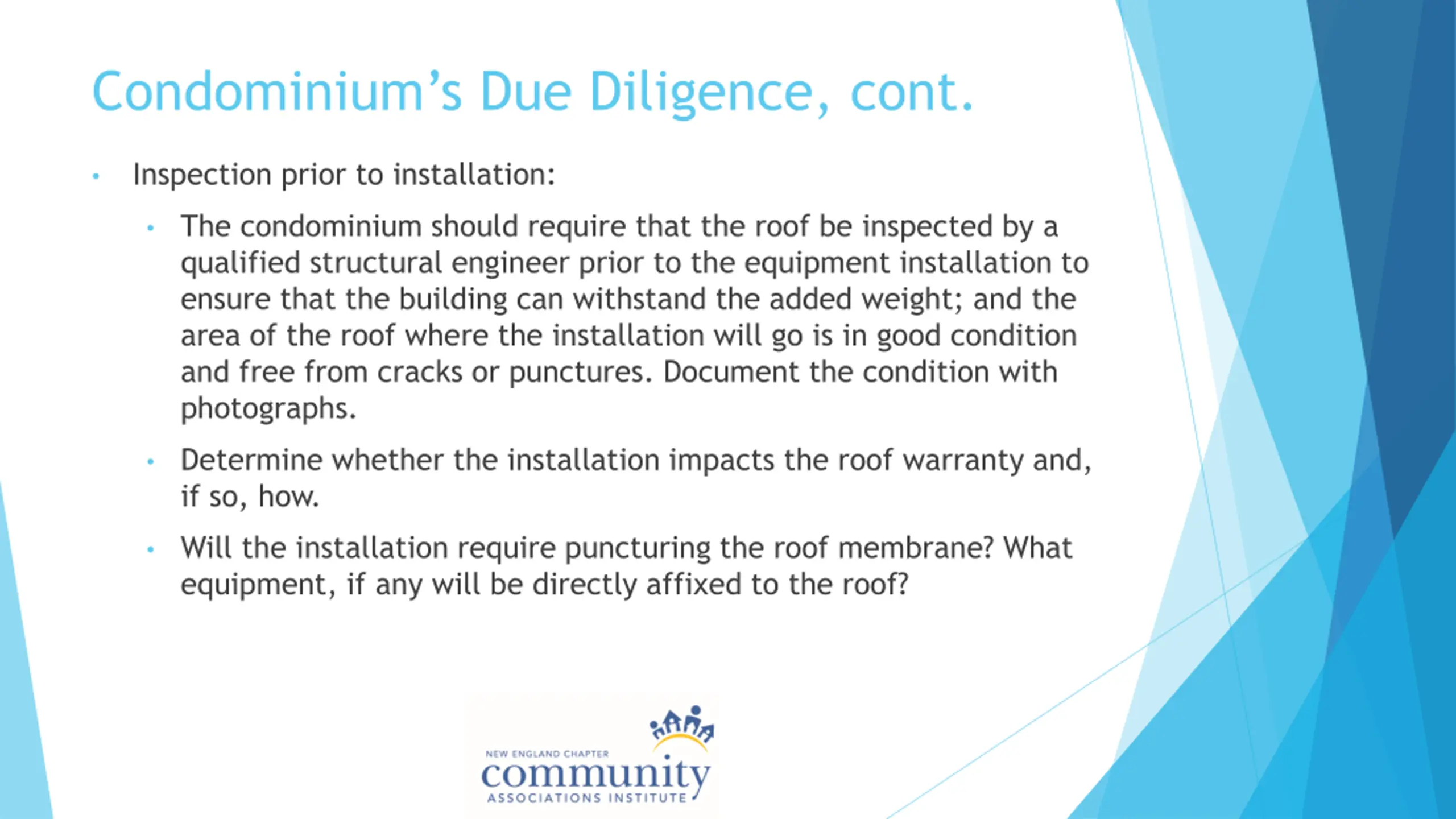 Condominiums Due Diligence, cont. Inspection prior to installation: The condominium should require that the roof be inspected by a qualified structural engineer prior to the equipment installation to ensure that the building can withstand the added weight; and the area of the roof where the installation will go is in good condition and free from cracks or punctures. Document the condition with photographs. Determine whether the installation impacts the roof warranty and, if so, how. Will the installation require puncturing the roof membrane? What equipment, if any will be directly affixed to the roof?