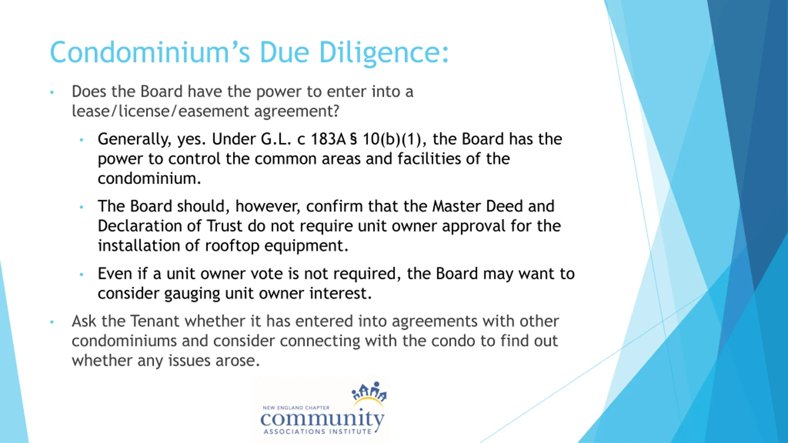 Condominiums Due Diligence: Does the Board have the power to enter into a lease/license/easement agreement? Generally, yes. Under G.L. c 183A 10(b)(1), the Board has the power to control the common areas and facilities of the condominium. The Board should, however, confirm that the Master Deed and Declaration of Trust do not require unit owner approval for the installation of rooftop equipment. Even if a unit owner vote is not required, the Board may want to consider gauging unit owner interest. Ask the Tenant whether it has entered into agreements with other condominiums and consider connecting with the condo to find out whether any issues arose.