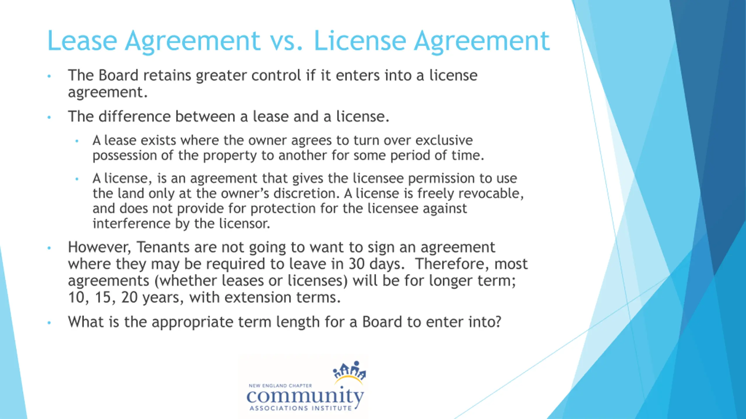 Lease Agreement vs. License Agreement The Board retains greater control if it enters into a license agreement. The difference between a lease and a license. A lease exists where the owner agrees to turn over exclusive possession of the property to another for some period of time. A license, is an agreement that gives the licensee permission to use the land only at the owner s discretion. A license is freely revocable, and does not provide for protection for the licensee against interference by the licensor. However, Tenants are not going to want to sign an agreement where they may be required to leave in 30 days. Therefore, most agreements (whether leases or licenses) will be for longer term; 10, 15, 20 years, with extension terms. What is the appropriate term length for a Board to enter into?