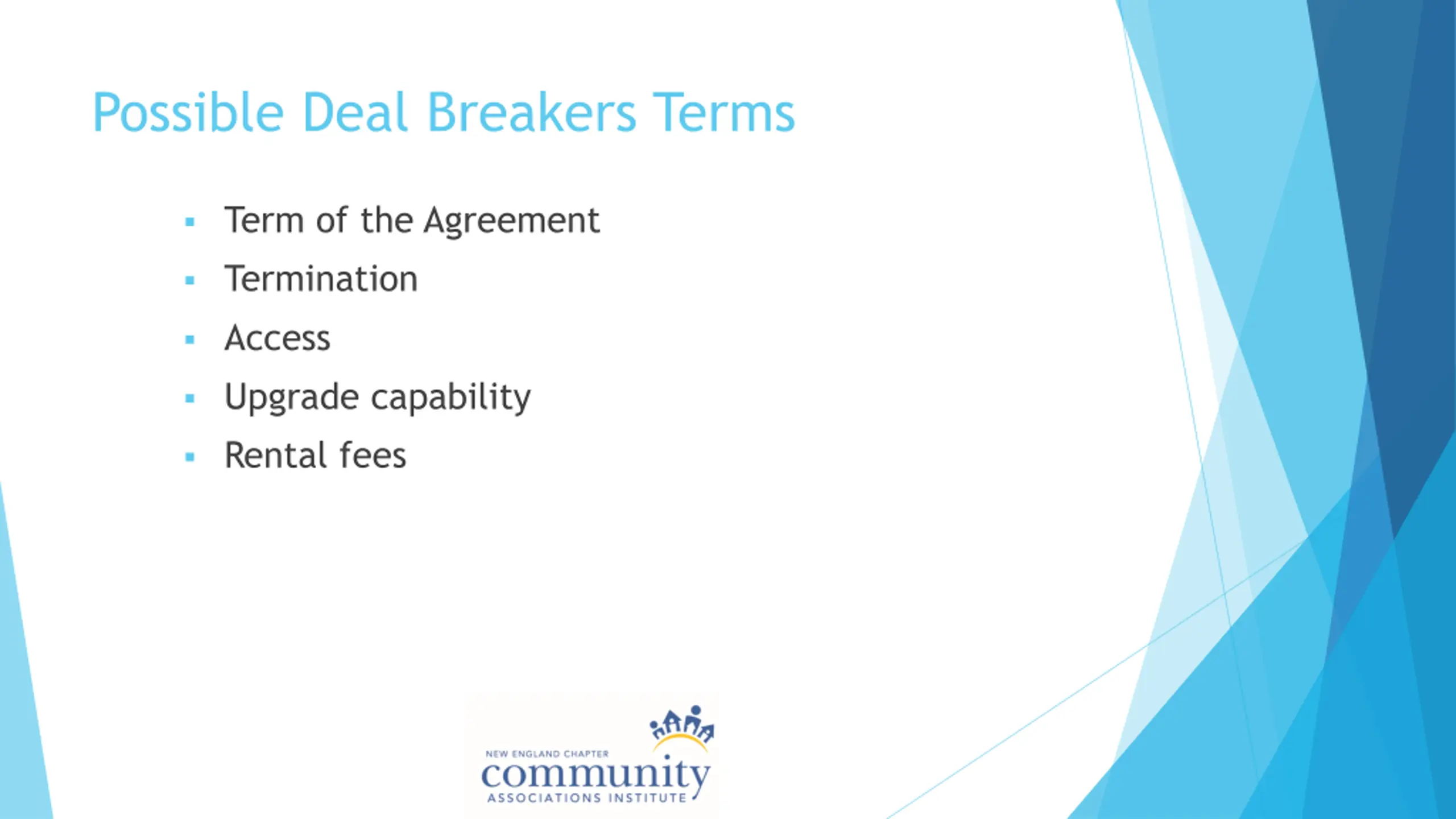 Possible Deal Breakers Terms Term of the Agreement Termination Access Upgrade capability Rental fees