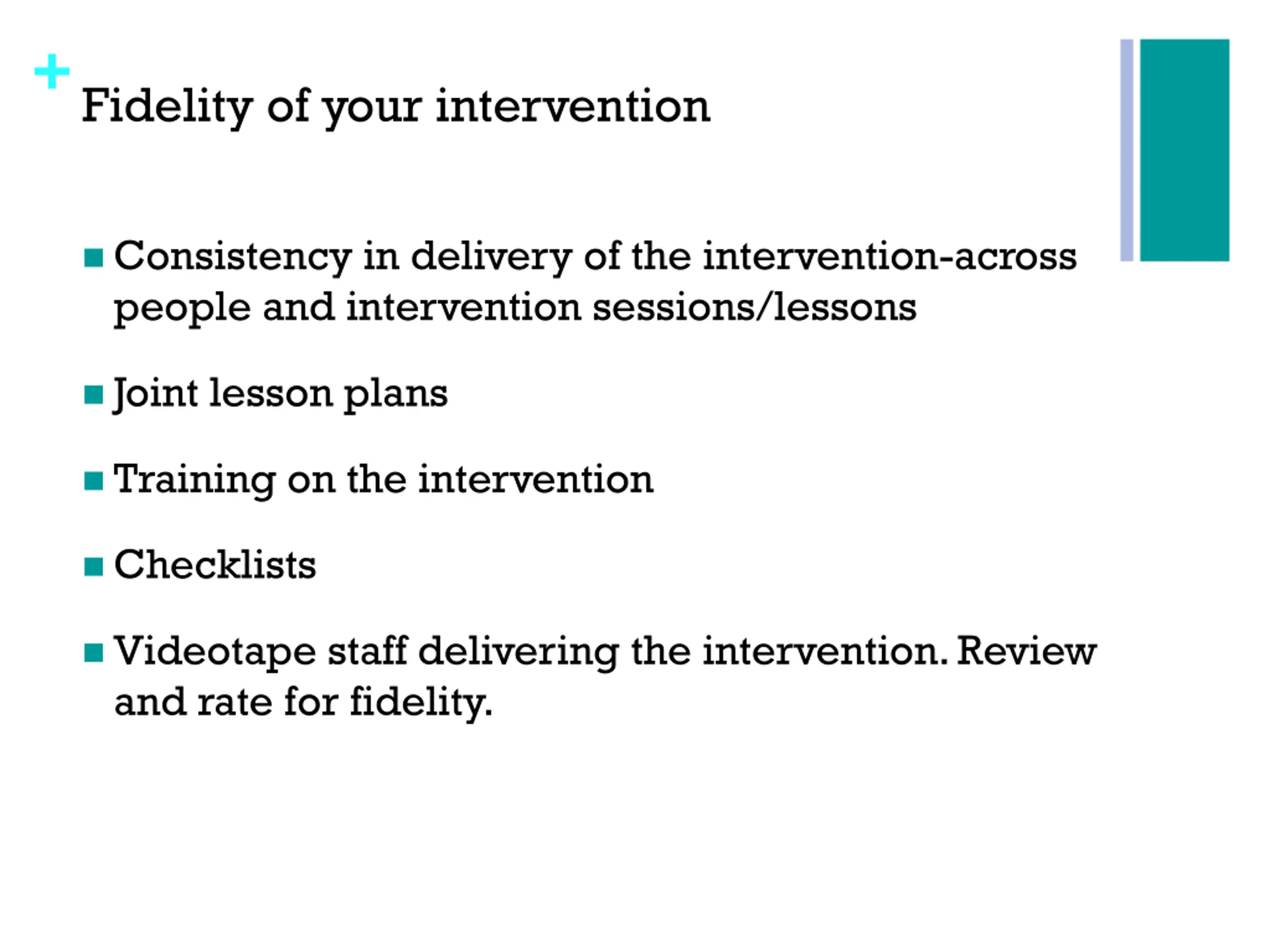 +Fidelity of your intervention Consistency in delivery of the intervention-across people and intervention sessions/lessons Joint lesson plans Training on the intervention Checklists Videotape staff delivering the intervention. Review and rate for fidelity.