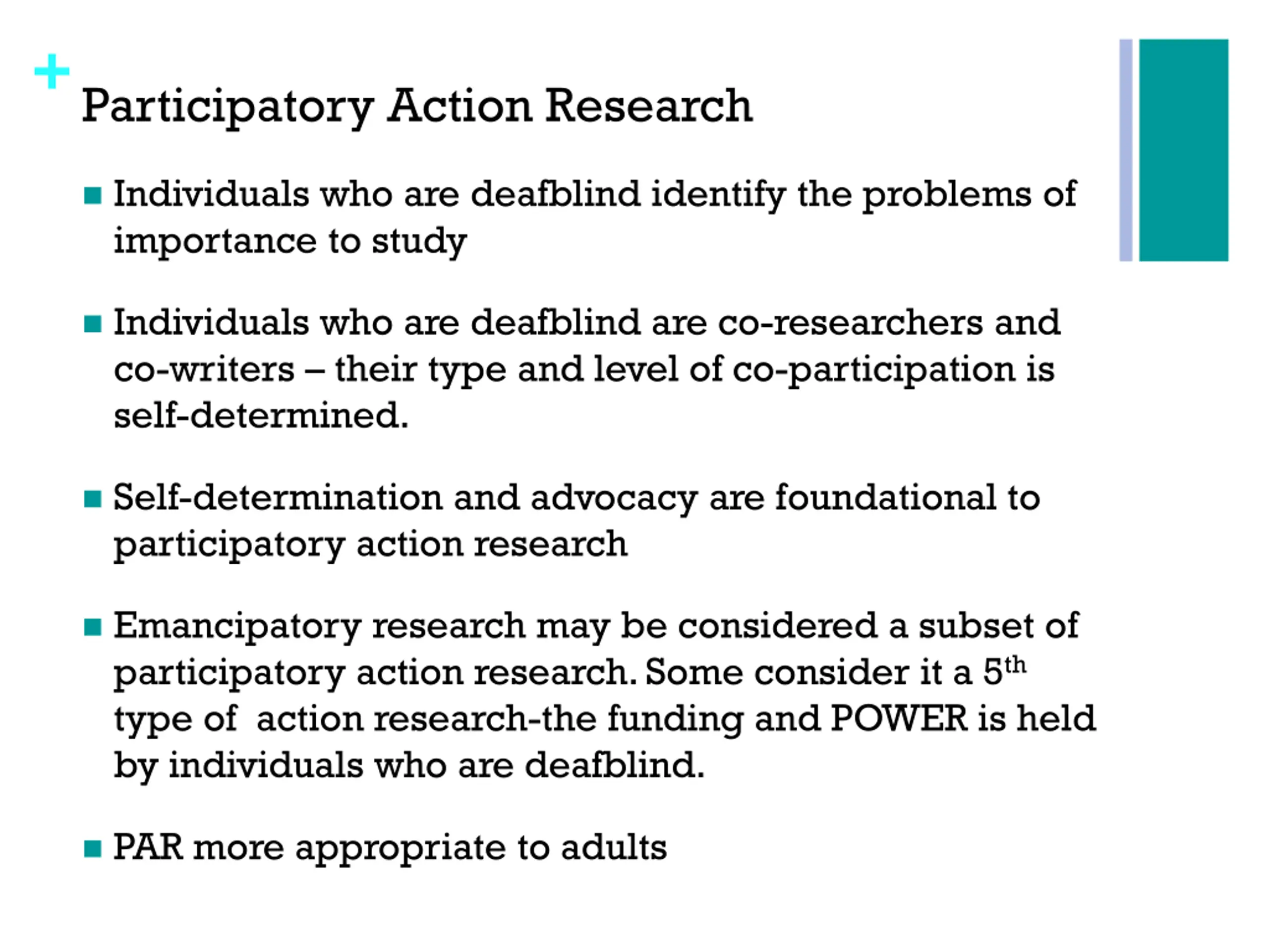 +Participatory Action Research Individuals who are deafblind identify the problems of importance to study Individuals who are deafblind are co-researchers and co-writers their type and level of co-participation is self-determined. Self-determination and advocacy are foundational to participatory action research Emancipatory research may be considered a subset of participatory action research. Some consider it a 5th type of action research-the funding and POWER is held by individuals who are deafblind. PAR more appropriate to adults