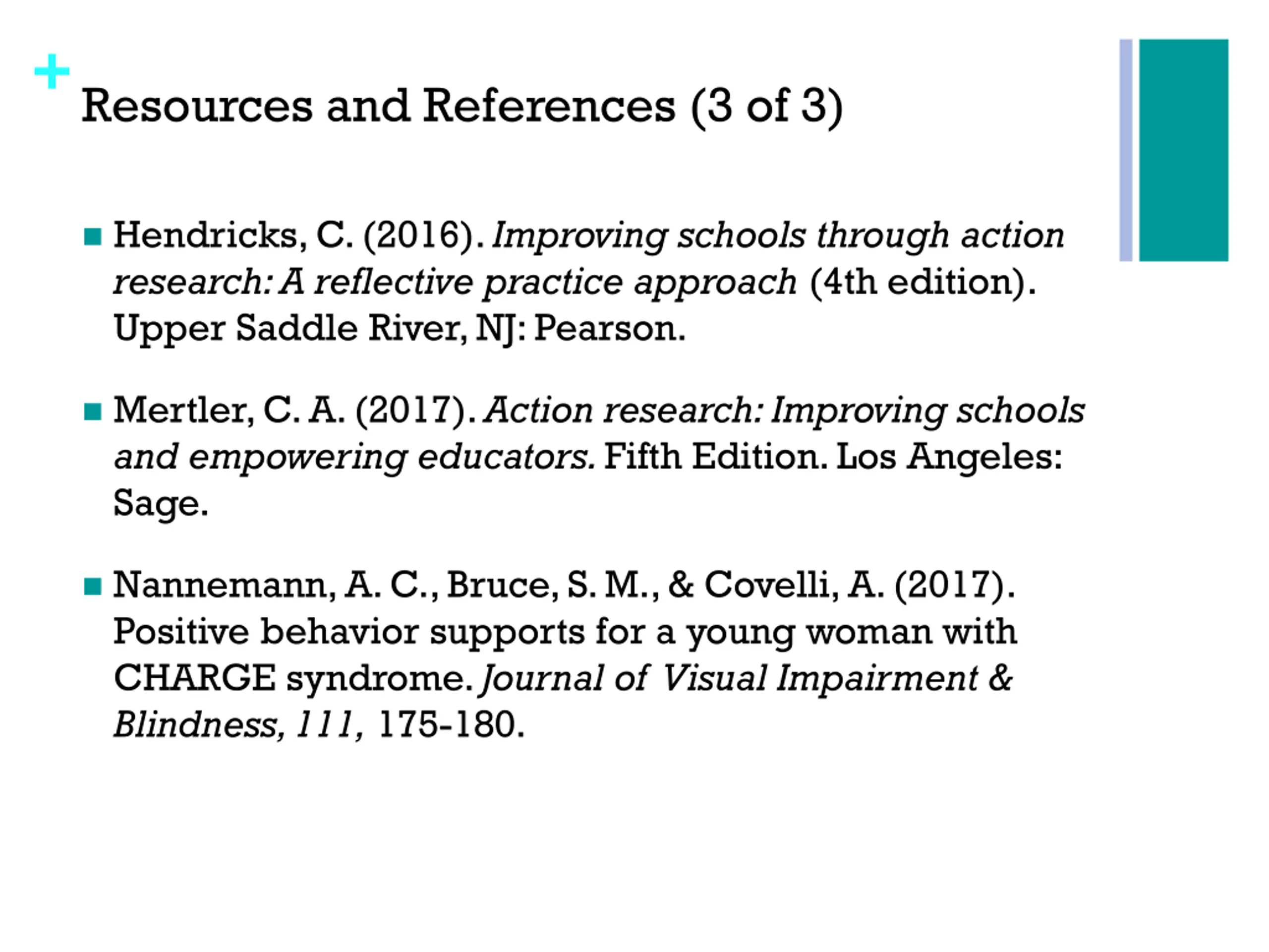 +Resources and References (3 of 3) Hendricks, C. (2016). Improving schools through action research: A reflective practice approach (4th edition). Upper Saddle River, NJ: Pearson. Mertler, C. A. (2017). Action research: Improving schools and empowering educators. Fifth Edition. Los Angeles: Sage. Nannemann, A. C., Bruce, S. M., & Covelli, A. (2017). Positive behavior supports for a young woman with CHARGE syndrome. Journal of Visual Impairment & Blindness, 111, 175-180.