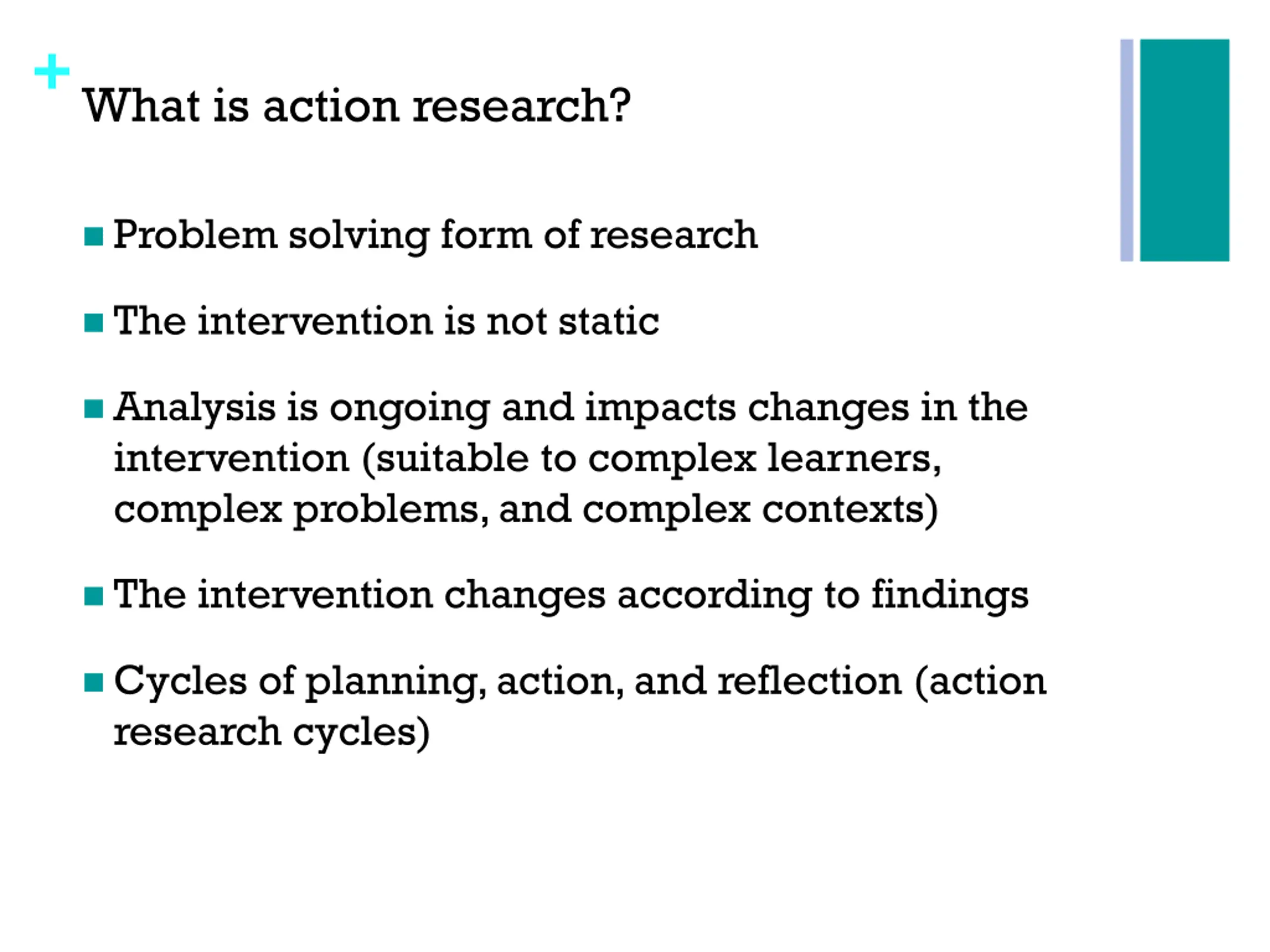 +What is action research? Problem solving form of research The intervention is not static Analysis is ongoing and impacts changes in the intervention (suitable to complex learners, complex problems, and complex contexts) The intervention changes according to findings Cycles of planning, action, and reflection (action research cycles)