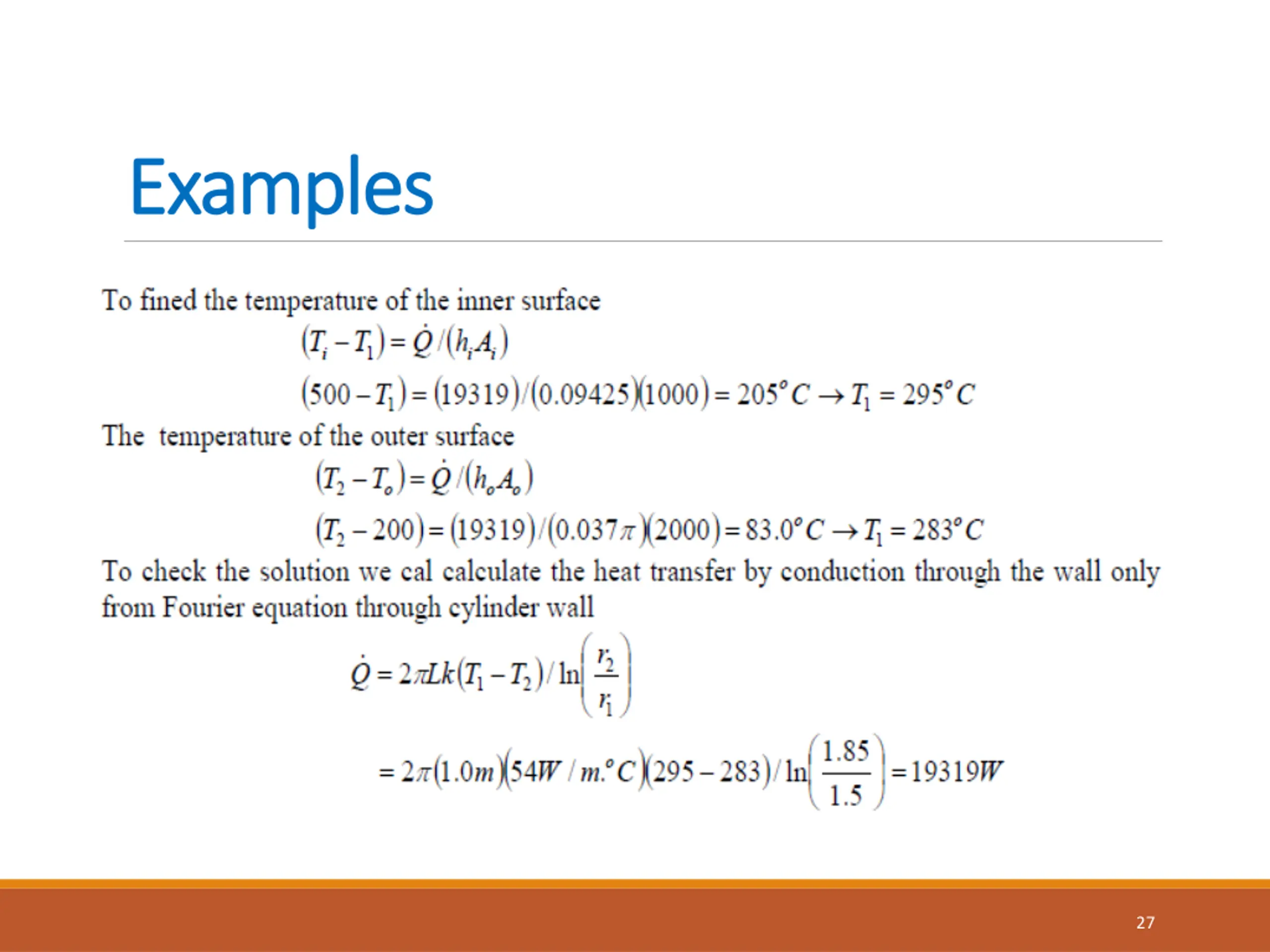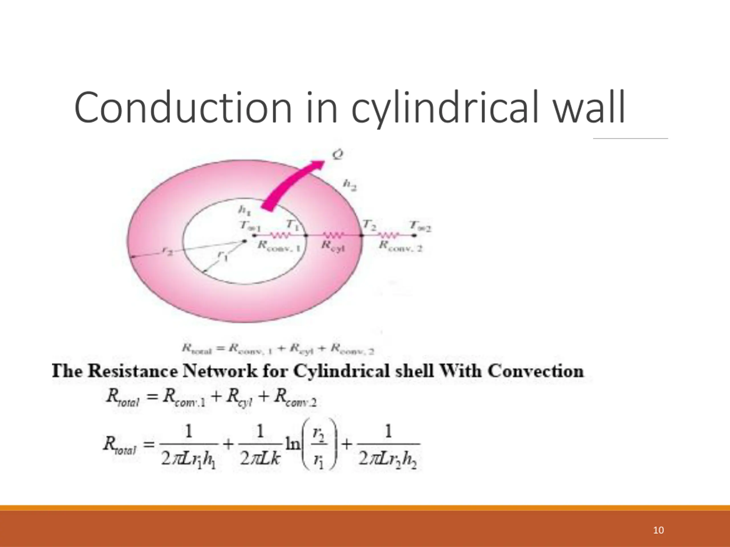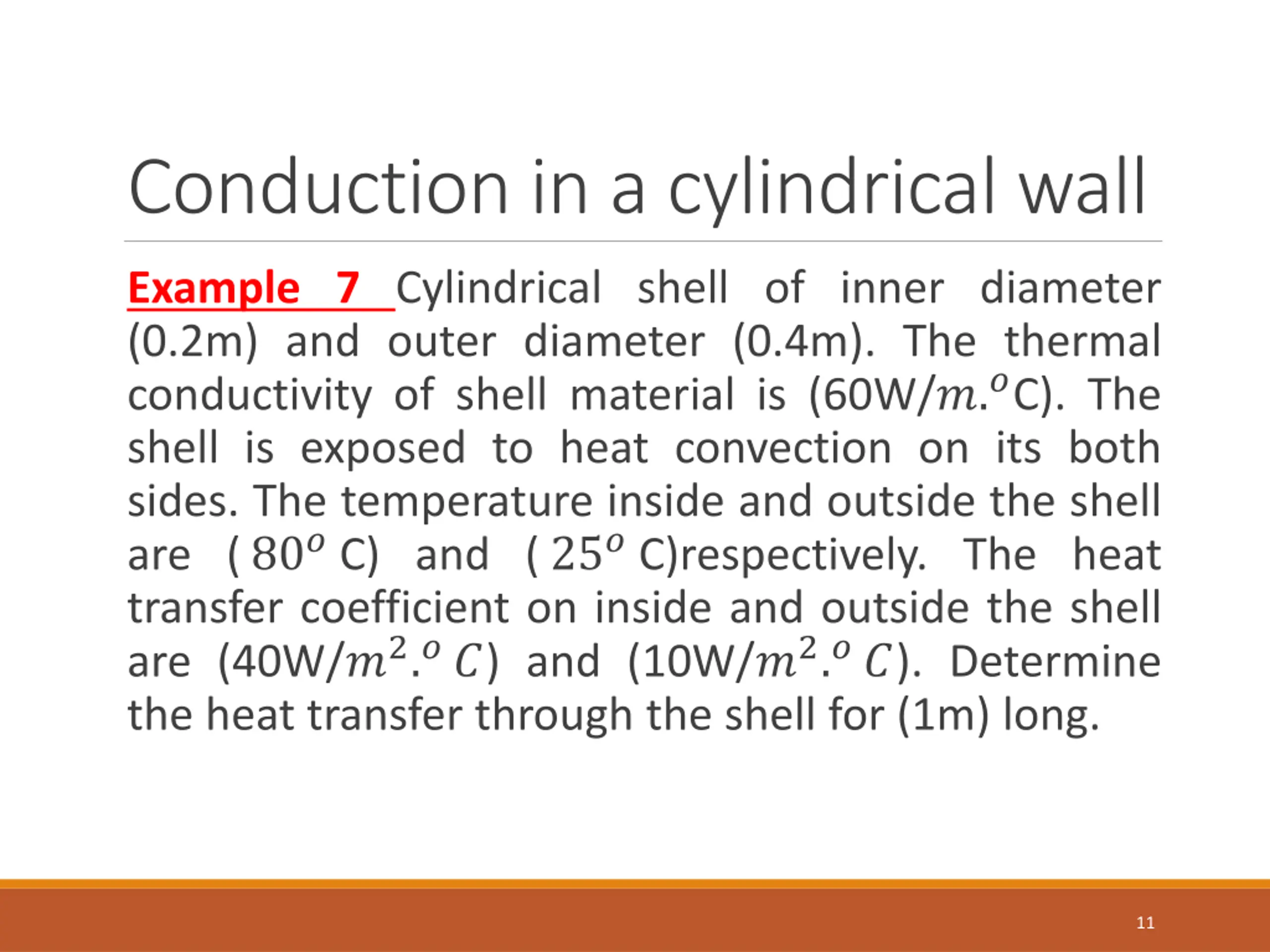 Examples Solution: cylindrical shell exposed to convection on its two surfaces. ?1 =0.2m and ?2=0.4m the temperature of fluids in and out the shell are ?1=80??, ?2=25?? Property: constant thermal conductivity k=60W/m.?C, constant heat transfer coefficient on the two sides of the shell are 1=40W/?2.??, and 2=10 W/?2.??. Assumption: steady one dimensional heat transfer through the shell. Analysis: to calculate the heat transfer through the cylindrical shell, we can find the thermal resistance as following. Convection resistance inside the shell 12