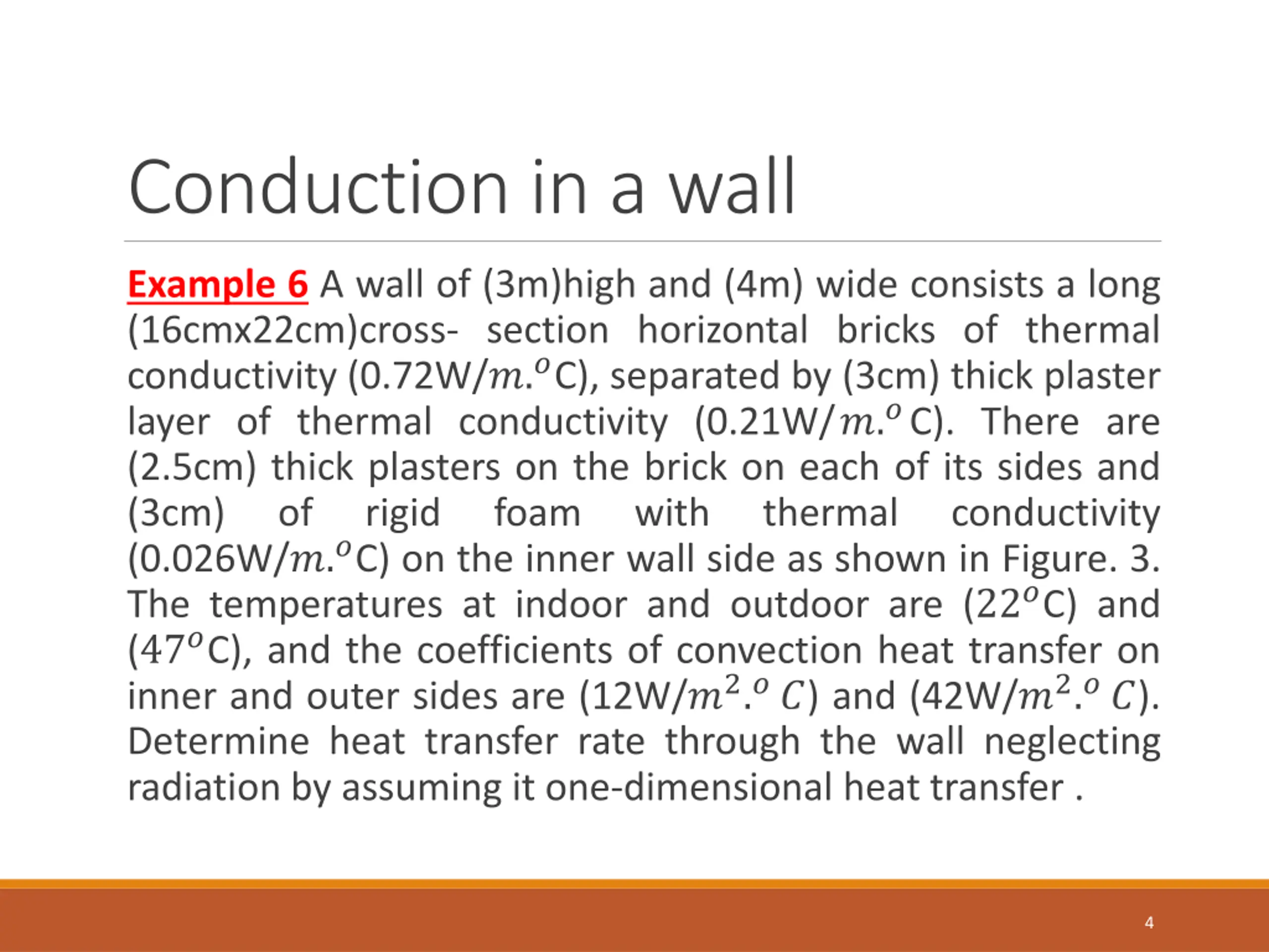Conduction in a wall Example 6 A wall of (3m)high and (4m) wide consists a long (16cmx22cm)cross- section horizontal bricks of thermal conductivity (0.72W/?.?C), separated by (3cm) thick plaster layer of thermal conductivity (0.21W/?.?C). There are (2.5cm) thick plasters on the brick on each of its sides and (3cm) of rigid foam with (0.026W/?.?C) on the inner wall side as shown in Figure. 3. The temperatures at indoor and outdoor are (22?C) and (47?C), and the coefficients of convection heat transfer on inner and outer sides are (12W/?2.??) and (42W/?2.??). Determine heat transfer rate through the wall neglecting radiation by assuming it one-dimensional heat transfer . thermal conductivity 4