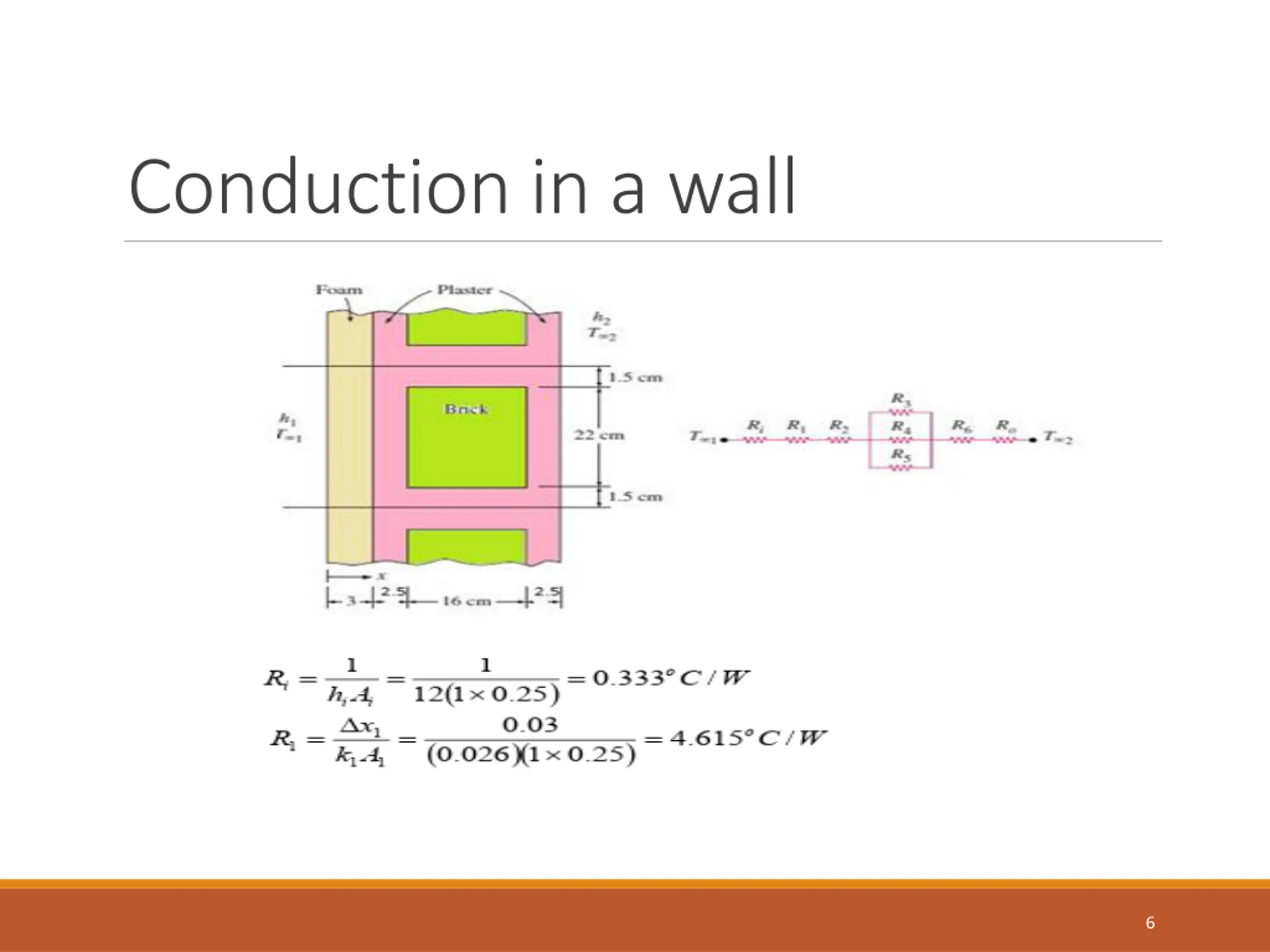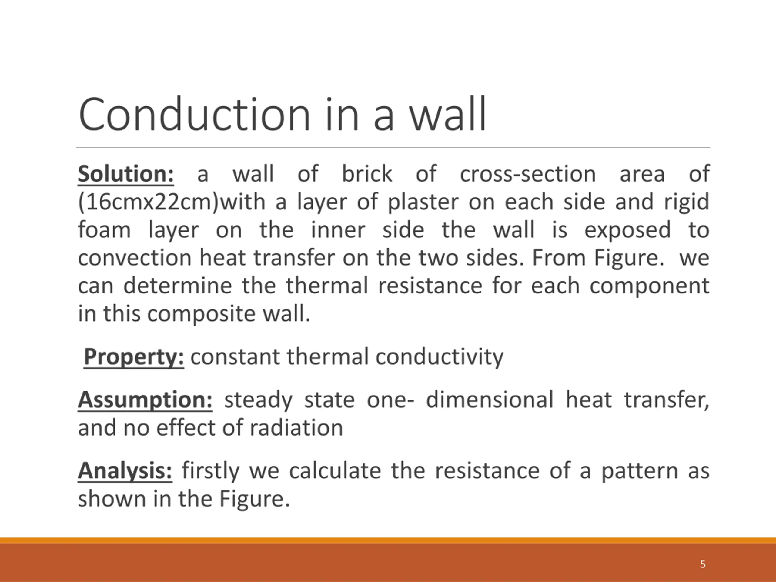 Conduction in a wall Solution: a wall of brick of cross-section area of (16cmx22cm)with a layer of plaster on each side and rigid foam layer on the inner side the wall is exposed to convection heat transfer on the two sides. From Figure. we can determine the thermal resistance for each component in this composite wall. Property: constant thermal conductivity Assumption: steady state one- dimensional heat transfer, and no effect of radiation Analysis: firstly we calculate the resistance of a pattern as shown in the Figure. 5