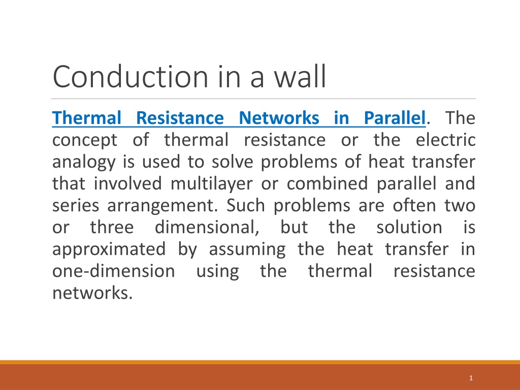 Conduction in a wall Thermal Resistance Networks in Parallel. The concept of thermal resistance or the electric analogy is used to solve problems of heat transfer that involved multilayer or combined parallel and series arrangement. Such problems are often two or three dimensional, approximated by assuming the heat transfer in one-dimension using the networks. but the solution is thermal resistance 1