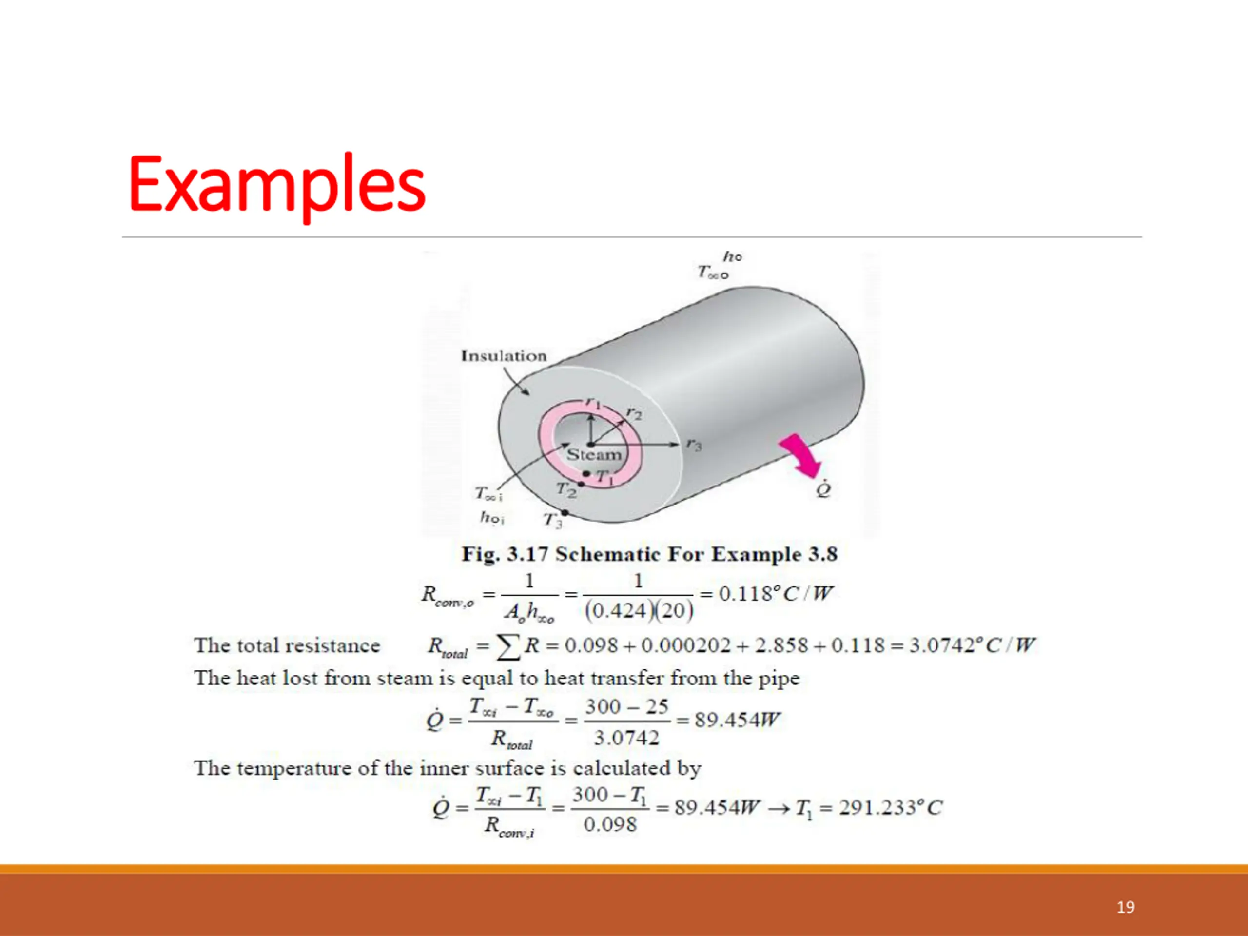 Examples Solution: A steam pipe of cast iron covered with glass wool insulation is subjected with convection on inner surface and combined convection and radiation on the outer surface. ?1=5cm, ?2=5.5cm, Insulation thickness t=4cm. ?3=5.5+8=13.5cm Property: the thermal conductivities of materials in this problem are constant and they are: ??=75W/?.??, and ??=0.05W/?.??. The coefficient of heat transfer inside the tube is: ?=65W/?2.??, outside the insulation is: ?=20W/?2.??. ? ?=300??, ? ?=25?? Assumption: The heat transfer is steady state and one dimensional Analysis: from the data of the example, we can fined 17