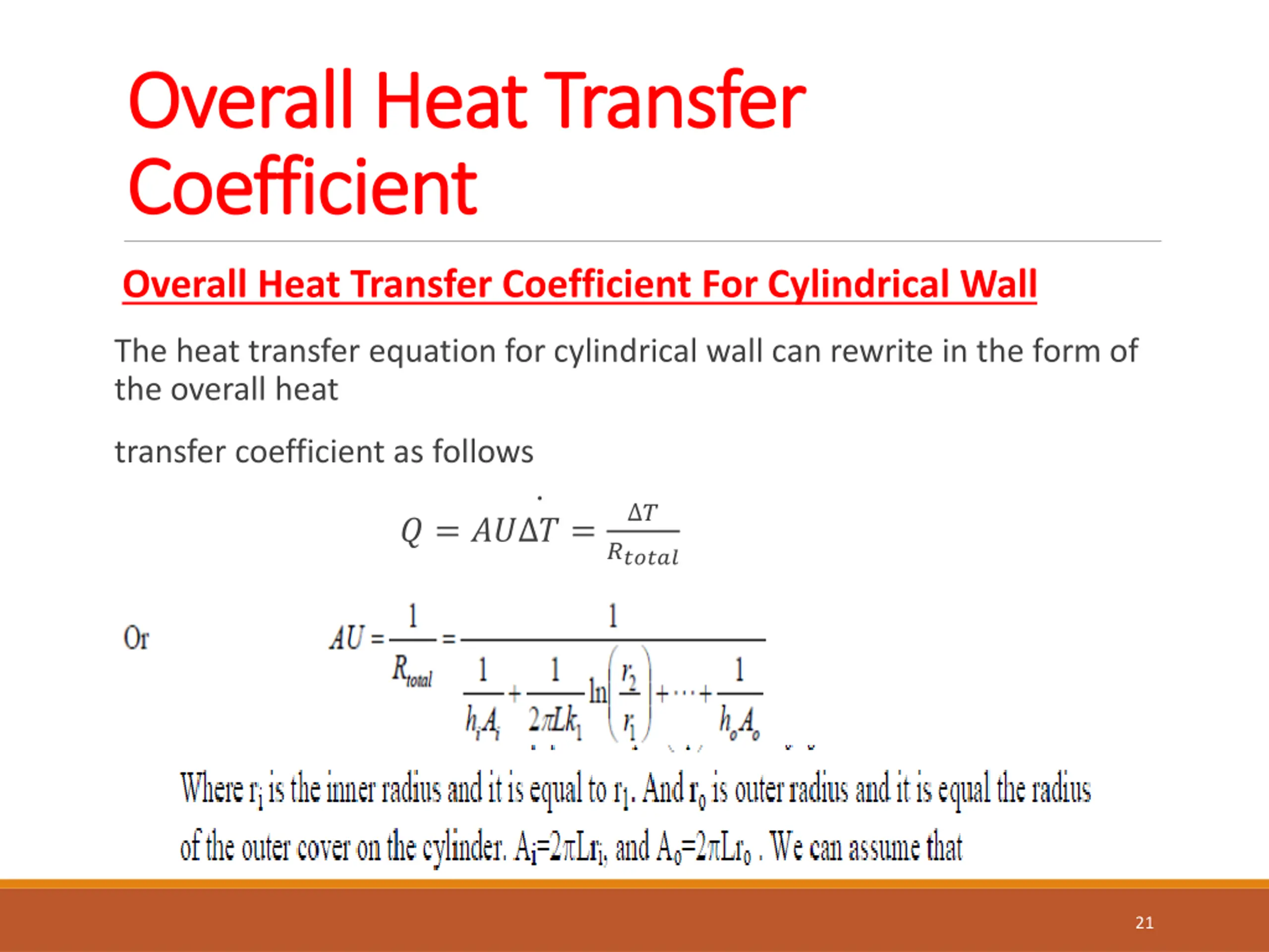 Overall Heat Transfer Overall Heat Transfer Coefficient Coefficient Overall Heat Transfer Coefficient For Cylindrical Wall The heat transfer equation for cylindrical wall can rewrite in the form of the overall heat transfer coefficient as follows ? ? = ?? ? = ?????? 21