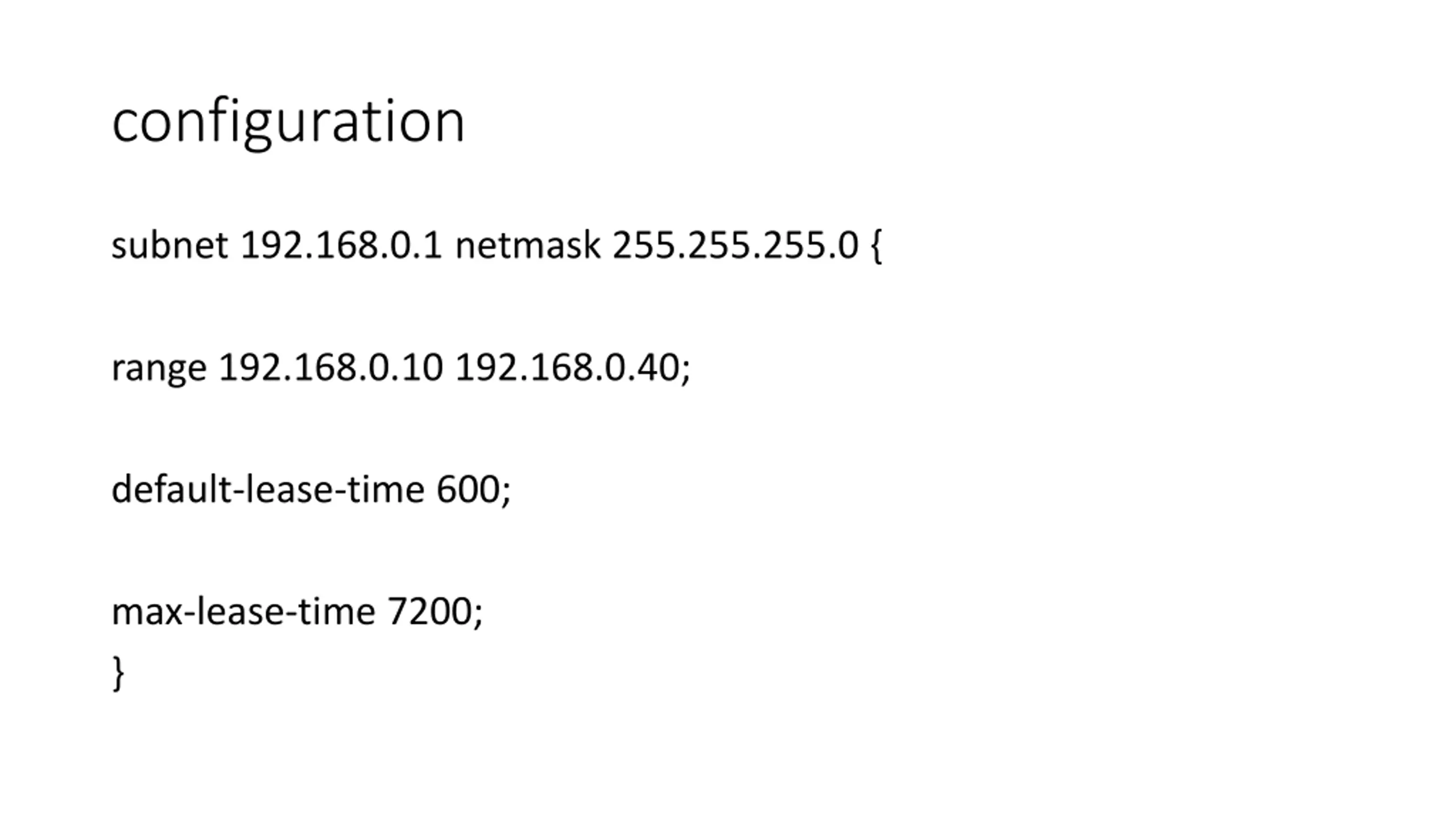 configuration subnet 192.168.0.1 netmask 255.255.255.0 { range 192.168.0.10 192.168.0.40; default-lease-time 600; max-lease-time 7200; }