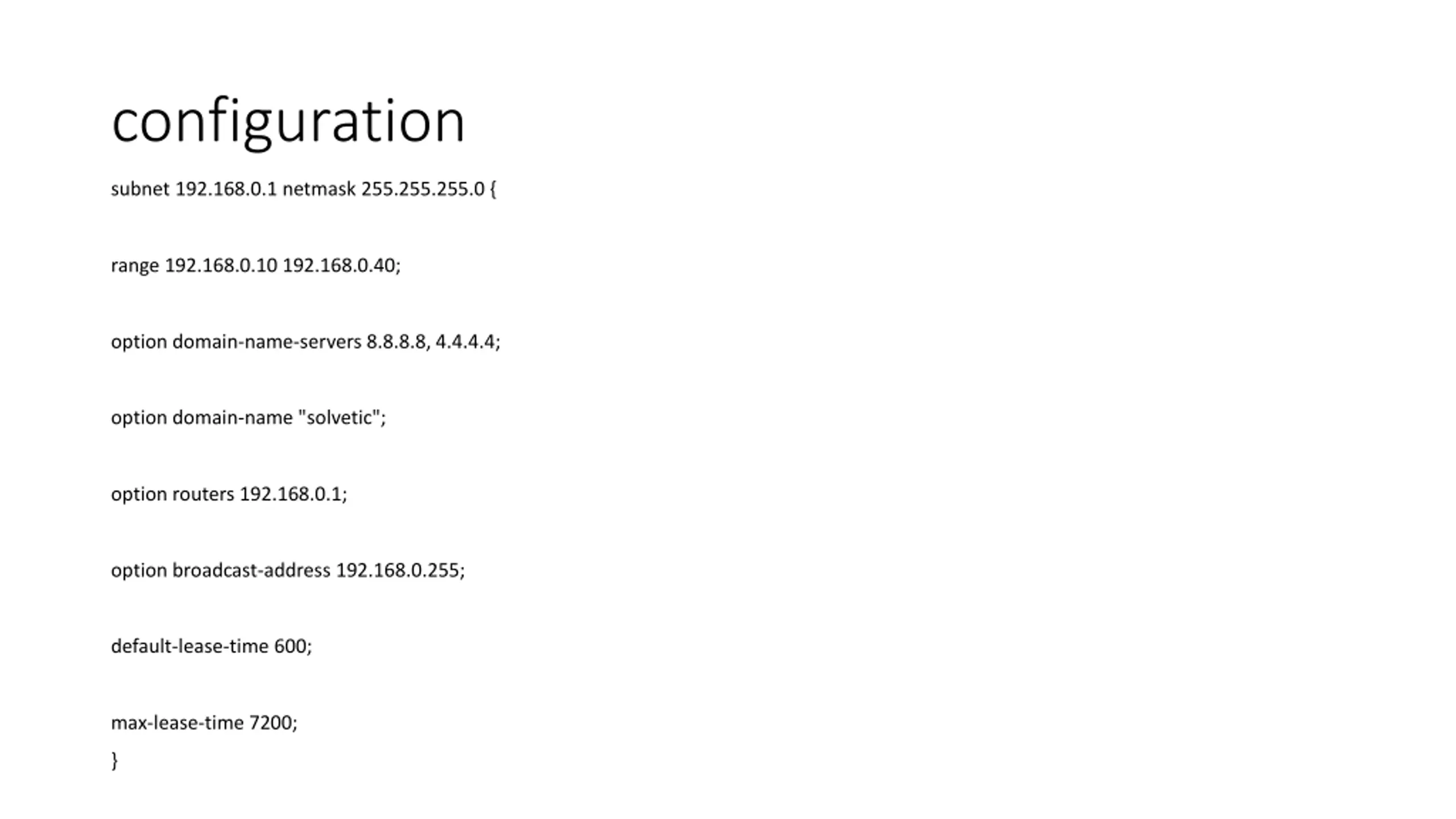 configuration subnet 192.168.0.1 netmask 255.255.255.0 { range 192.168.0.10 192.168.0.40; option domain-name-servers 8.8.8.8, 4.4.4.4; option domain-name "solvetic"; option routers 192.168.0.1; option broadcast-address 192.168.0.255; default-lease-time 600; max-lease-time 7200; }