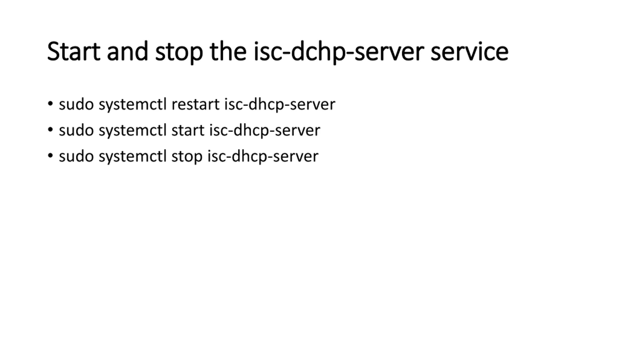 Start and stop the Start and stop the isc isc- -dchp dchp- -server server service service sudo systemctl restart isc-dhcp-server sudo systemctl start isc-dhcp-server sudo systemctl stop isc-dhcp-server