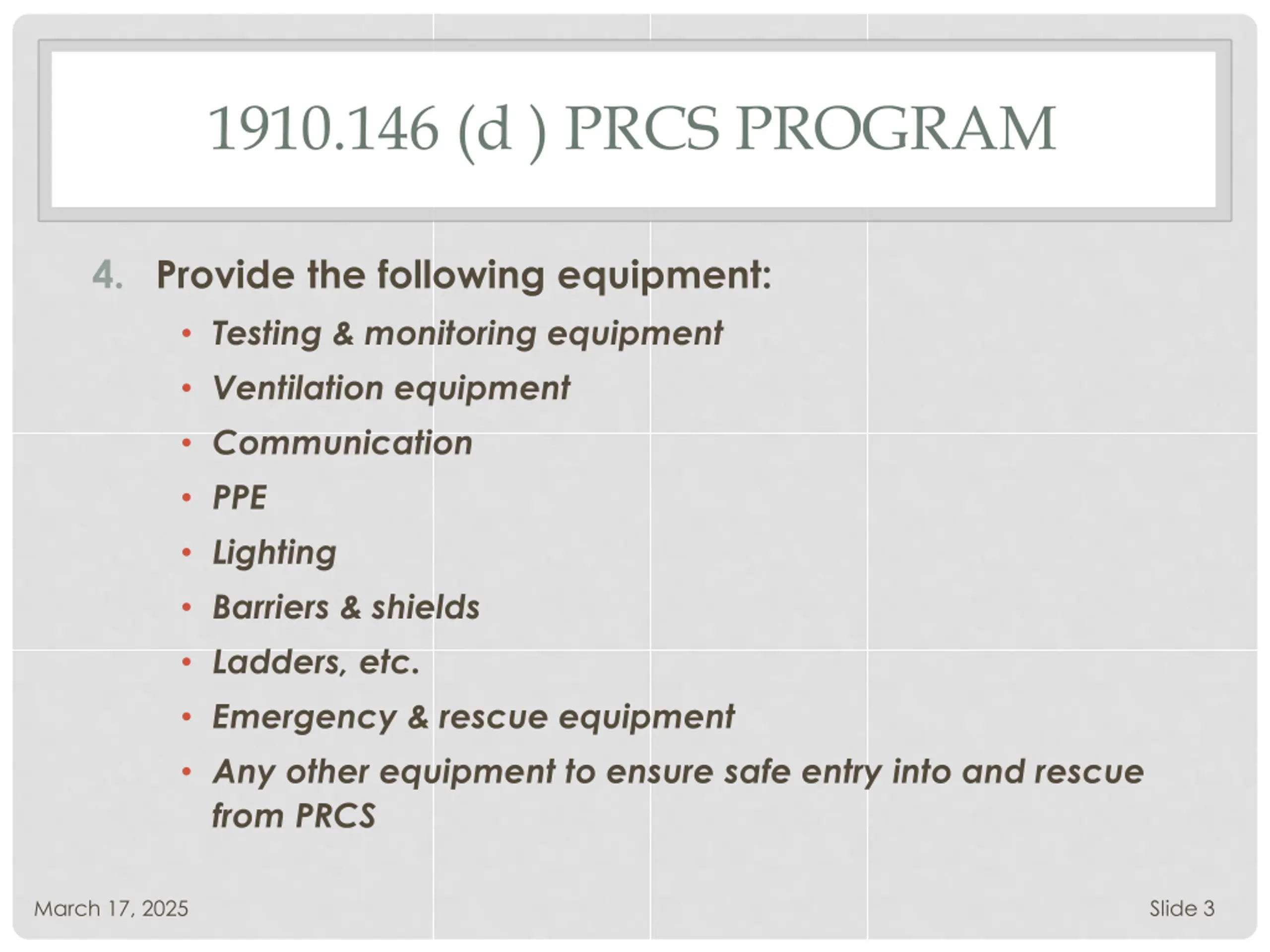 1910.146 (d ) PRCS PROGRAM 4. Provide the following equipment: Testing & monitoring equipment Ventilation equipment Communication PPE Lighting Barriers & shields Ladders, etc. Emergency & rescue equipment Any other equipment to ensure safe entry into and rescue from PRCS March 17, 2025 Slide 3
