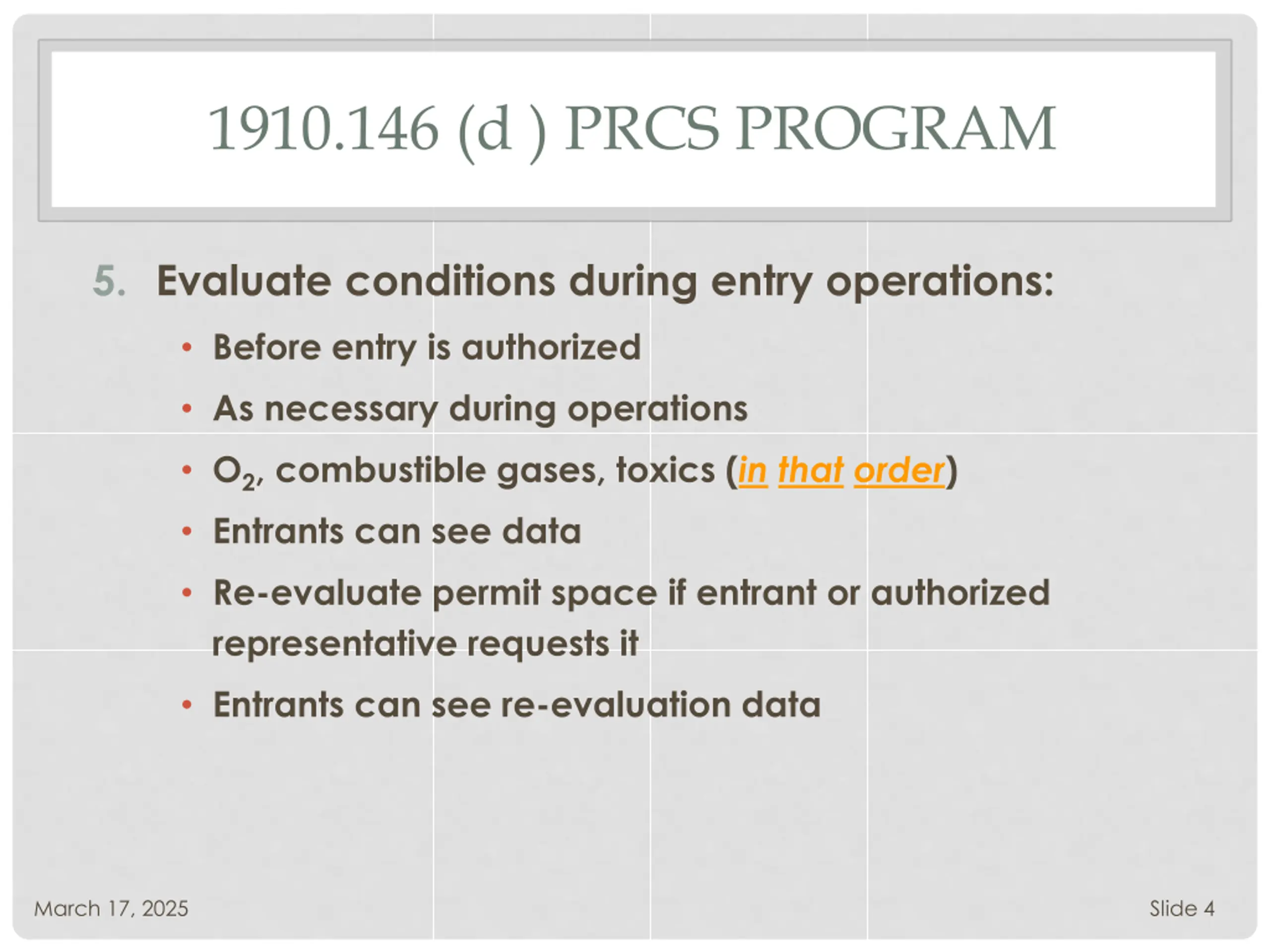 1910.146 (d ) PRCS PROGRAM 5. Evaluate conditions during entry operations: Before entry is authorized As necessary during operations O2, combustible gases, toxics (in that order) Entrants can see data Re-evaluate permit space if entrant or authorized representative requests it Entrants can see re-evaluation data March 17, 2025 Slide 4