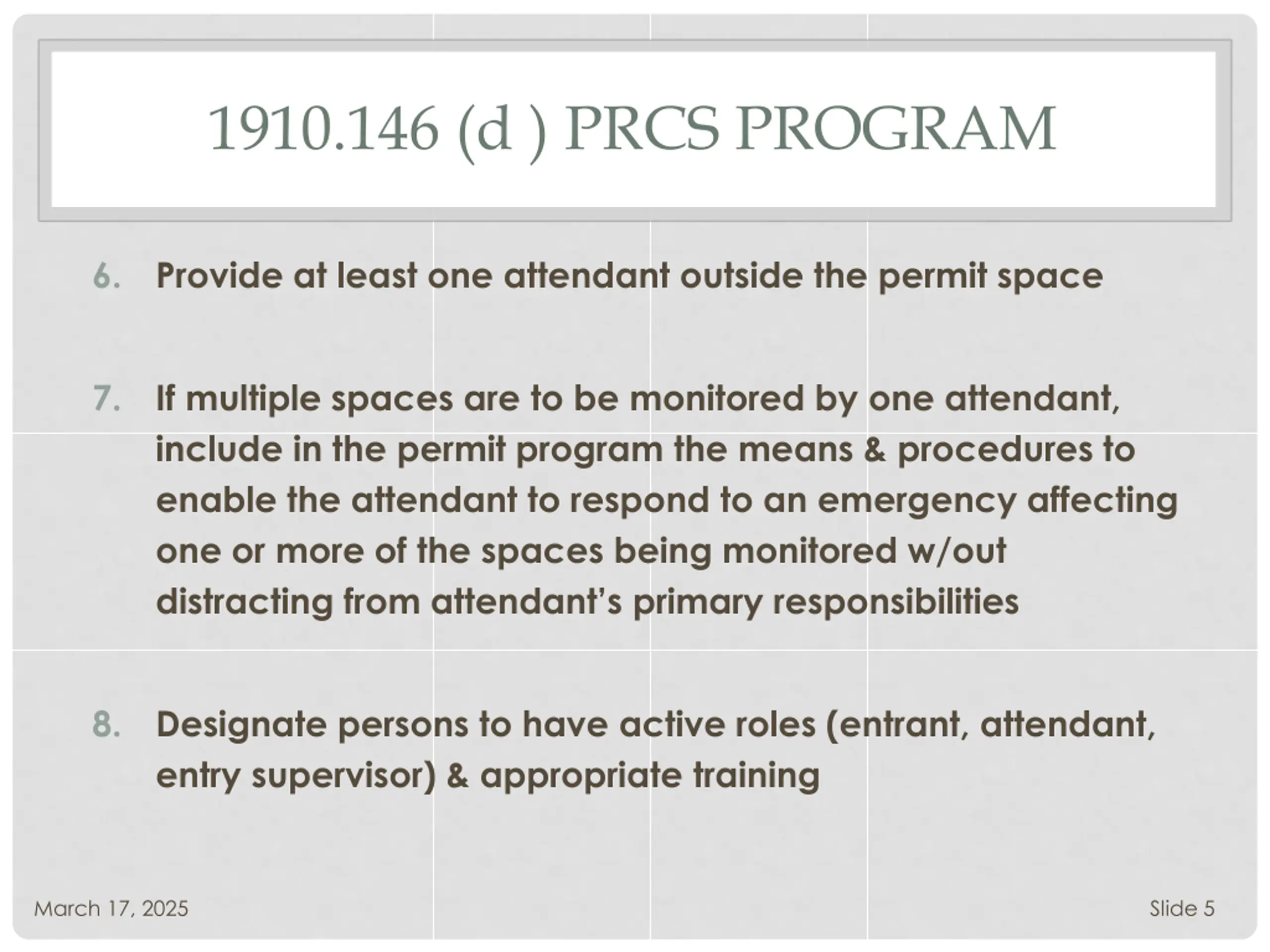 1910.146 (d ) PRCS PROGRAM 6. Provide at least one attendant outside the permit space 7. If multiple spaces are to be monitored by one attendant, include in the permit program the means & procedures to enable the attendant to respond to an emergency affecting one or more of the spaces being monitored w/out distracting from attendant s primary responsibilities 8. Designate persons to have active roles (entrant, attendant, entry supervisor) & appropriate training March 17, 2025 Slide 5