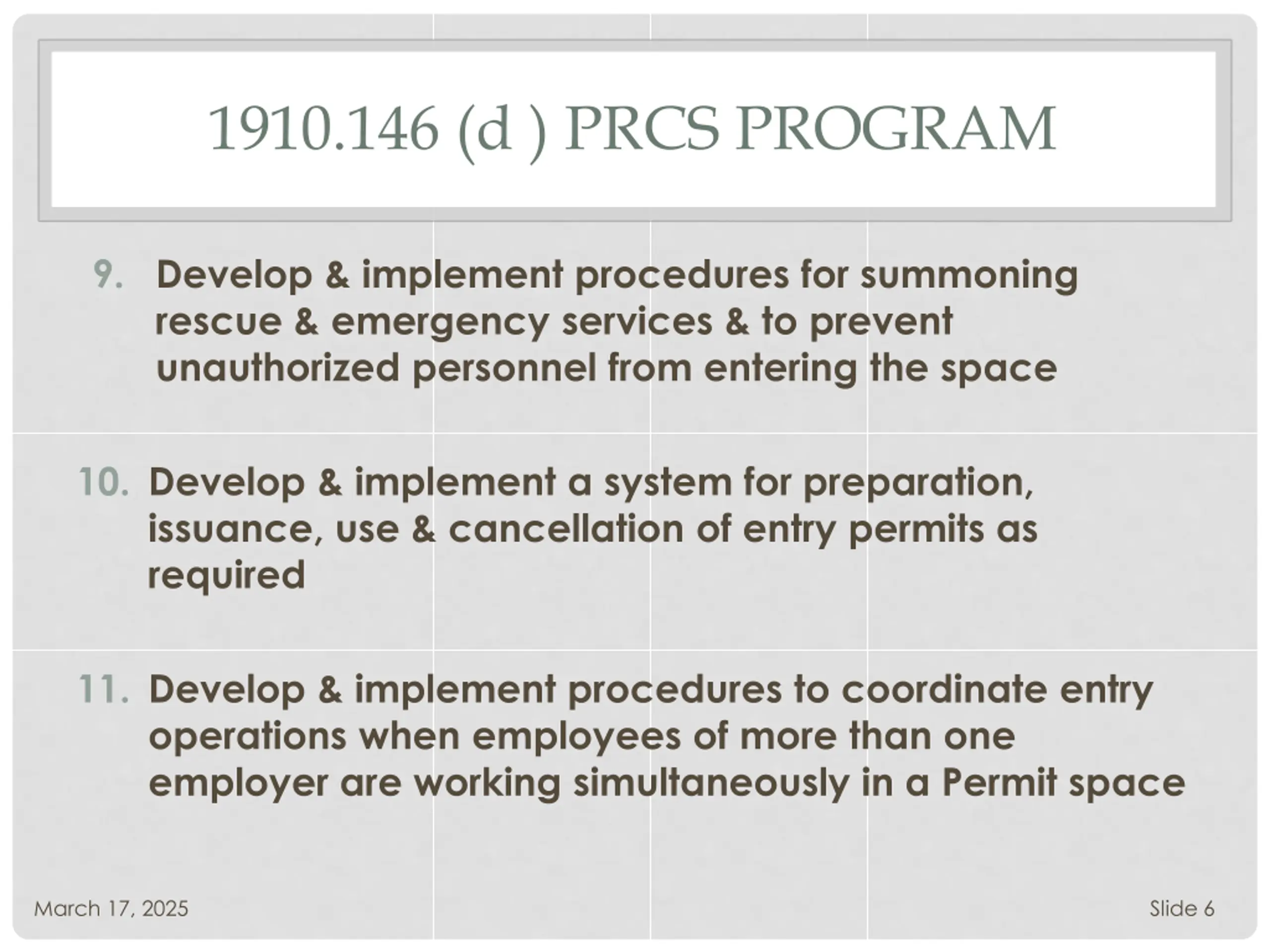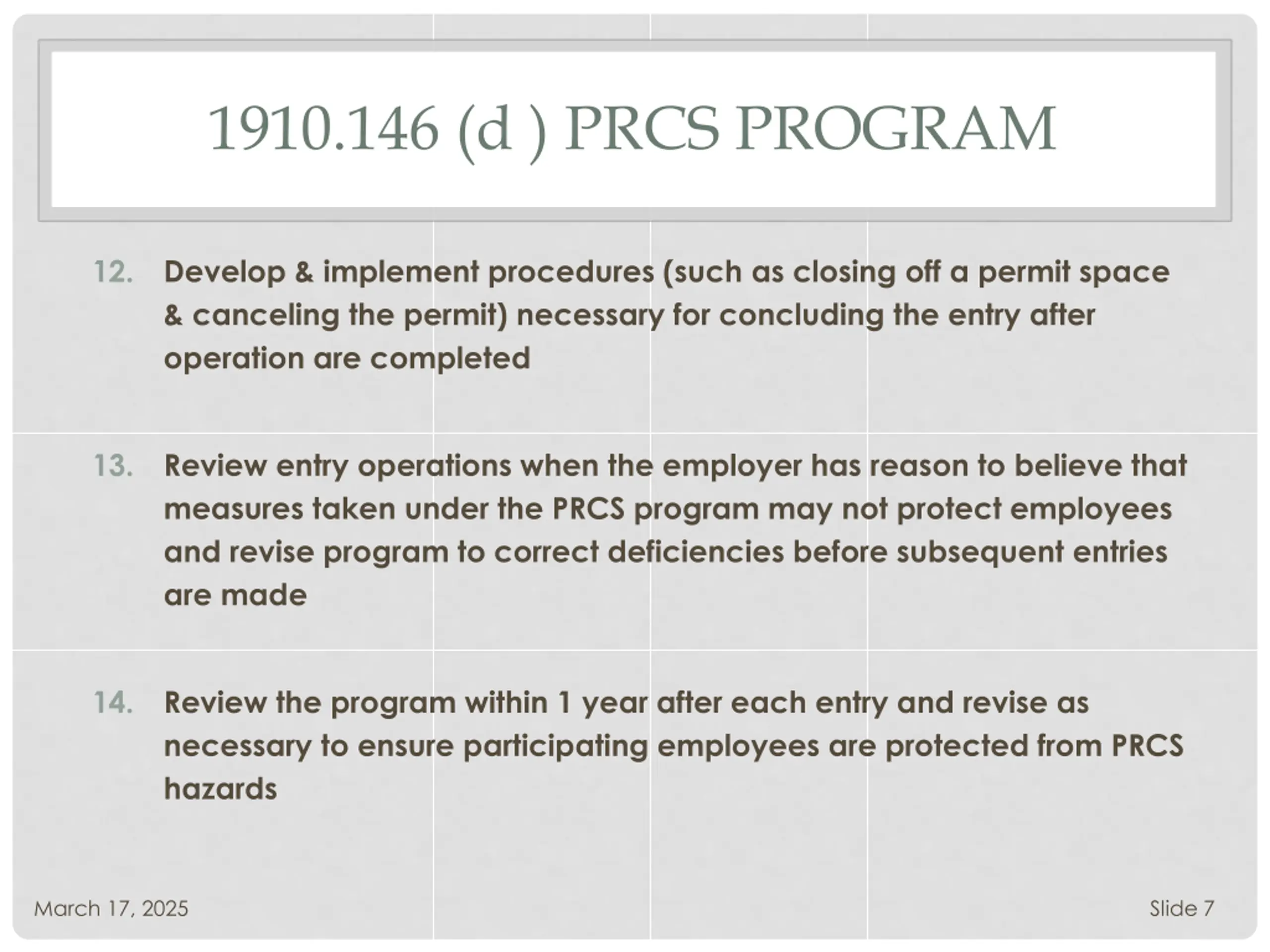 1910.146 (d ) PRCS PROGRAM 9. Develop & implement procedures for summoning rescue & emergency services & to prevent unauthorized personnel from entering the space 10. Develop & implement a system for preparation, issuance, use & cancellation of entry permits as required 11. Develop & implement procedures to coordinate entry operations when employees of more than one employer are working simultaneously in a Permit space March 17, 2025 Slide 6