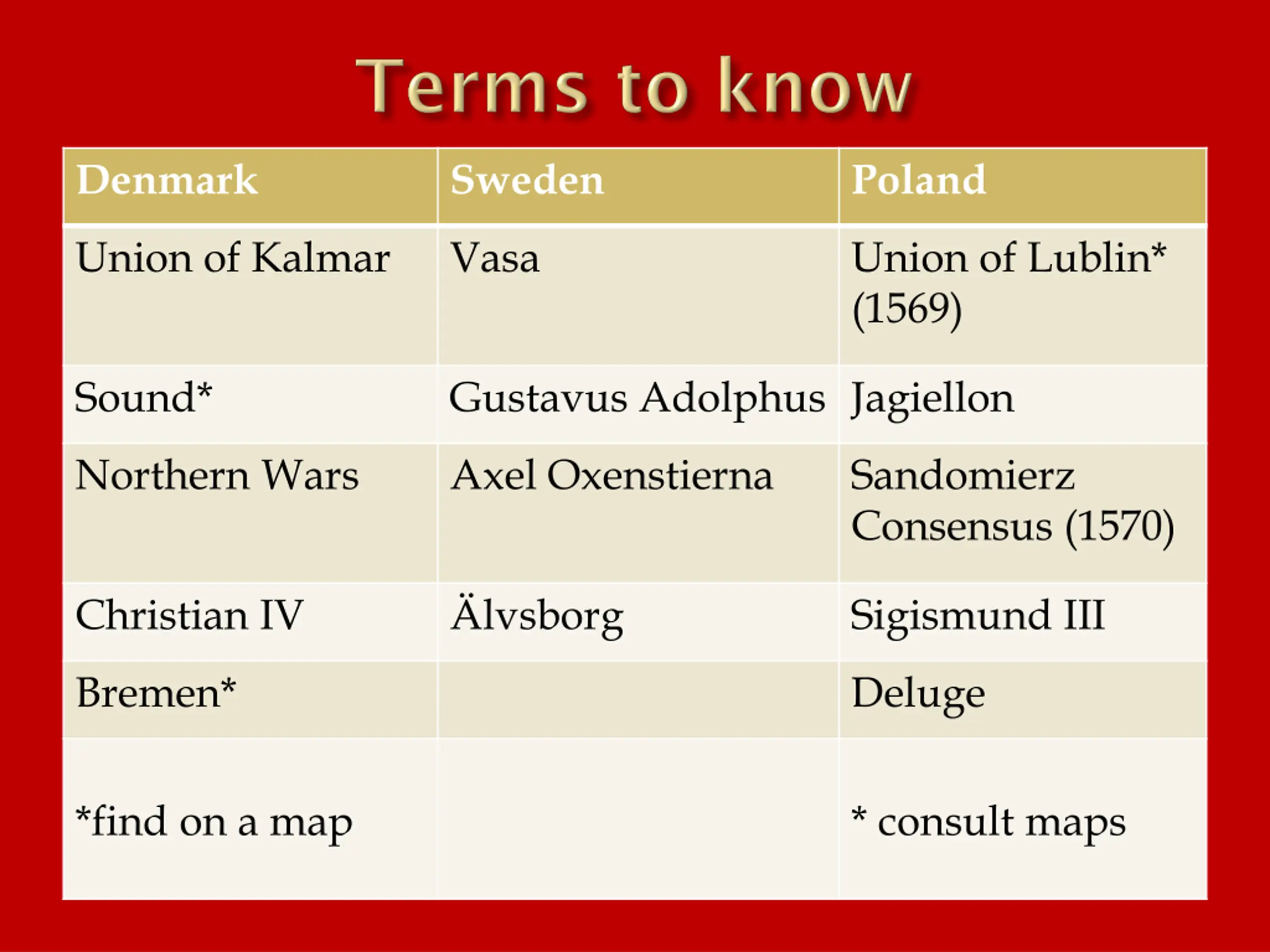 Denmark Sweden Poland Union of Kalmar Vasa Union of Lublin* (1569) Sound* Gustavus Adolphus Jagiellon Northern Wars Axel Oxenstierna Sandomierz Consensus (1570) Christian IV lvsborg Sigismund III Bremen* Deluge *find on a map * consult maps