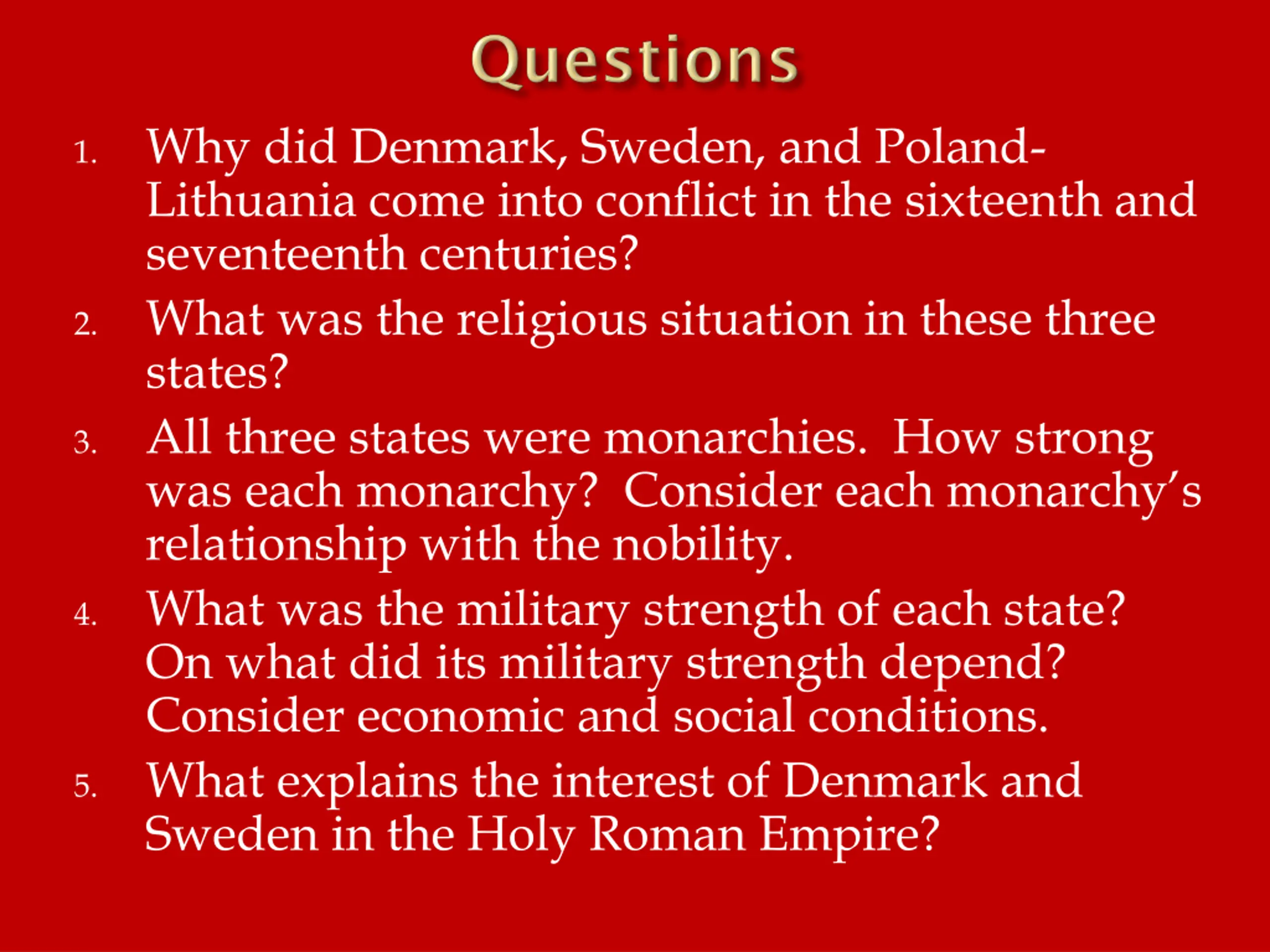 Why did Denmark, Sweden, and Poland- Lithuania come into conflict in the sixteenth and seventeenth centuries? What was the religious situation in these three states? All three states were monarchies. How strong was each monarchy? Consider each monarchy s relationship with the nobility. What was the military strength of each state? On what did its military strength depend? Consider economic and social conditions. What explains the interest of Denmark and Sweden in the Holy Roman Empire? 1. 2. 3. 4. 5.