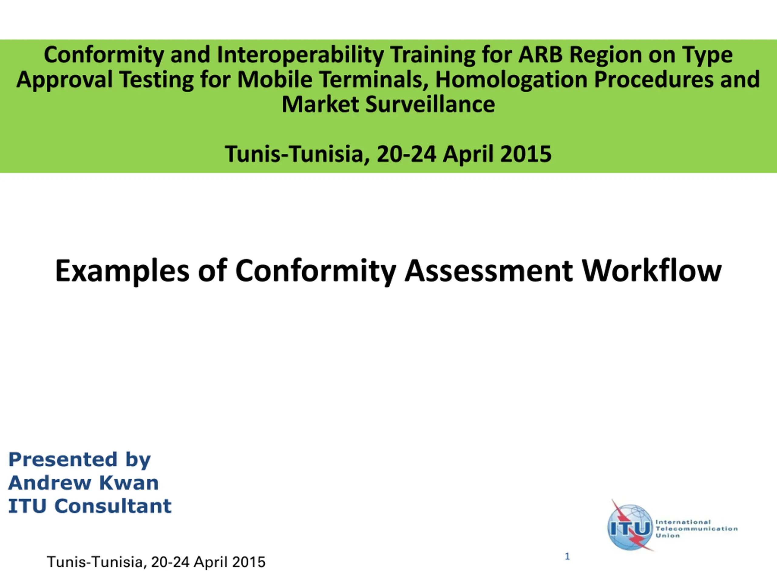 Conformity and Interoperability Training for ARB Region on Type Approval Testing for Mobile Terminals, Homologation Procedures and Market Surveillance Tunis-Tunisia, 20-24 April 2015 Examples of Conformity Assessment Workflow Presented by Andrew Kwan ITU Consultant 1 Tunis-Tunisia, 20-24 April 2015