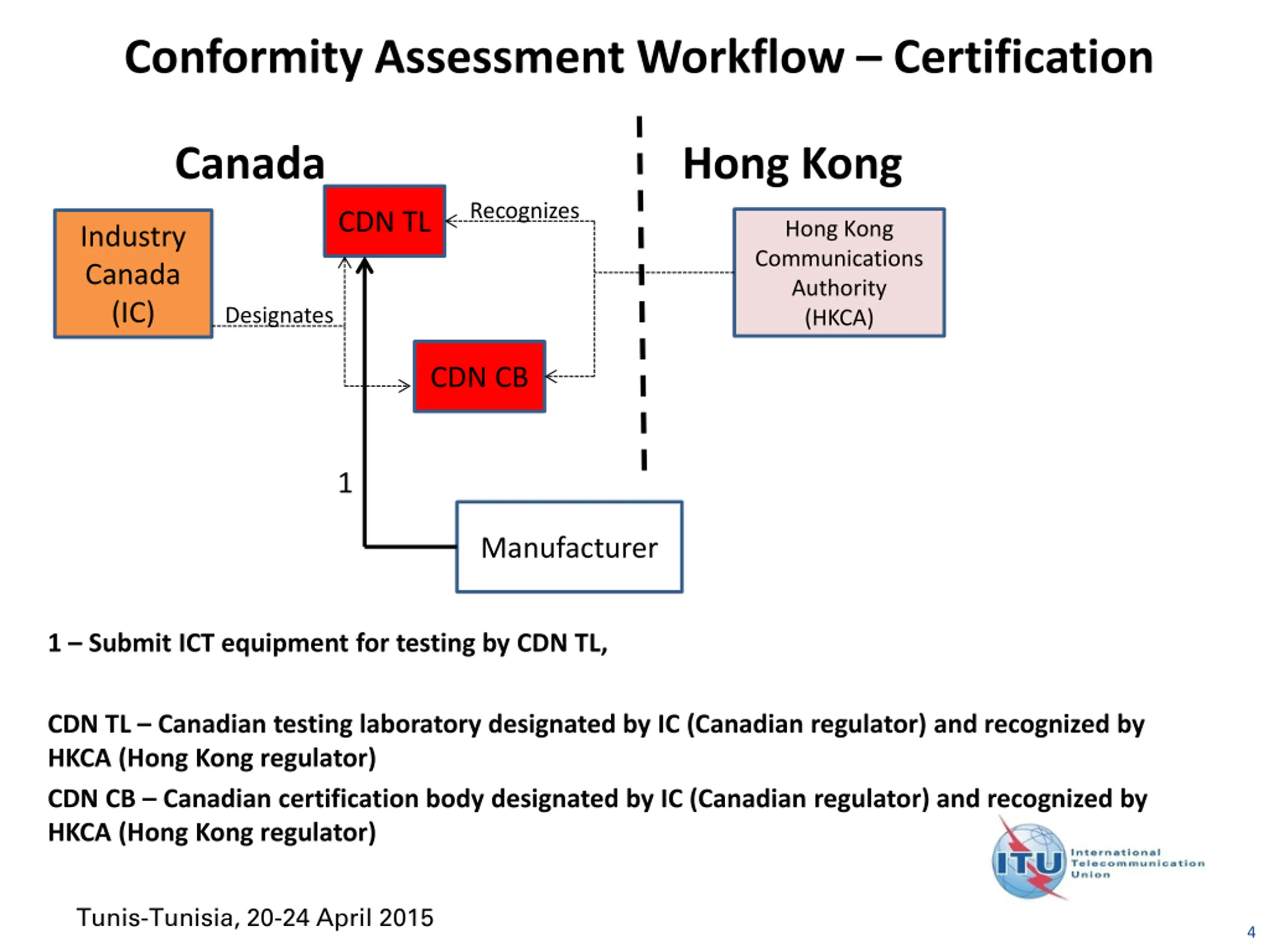 Conformity Assessment Workflow Certification Canada Hong Kong Recognizes CDN TL Hong Kong Communications Authority (HKCA) Industry Canada (IC) Designates CDN CB Manufacturer CDN TL Canadian testing laboratory designated by IC (Canadian regulator) and recognized by HKCA (Hong Kong regulator) CDN CB Canadian certification body designated by IC (Canadian regulator) and recognized by HKCA (Hong Kong regulator) Tunis-Tunisia, 20-24 April 2015 3