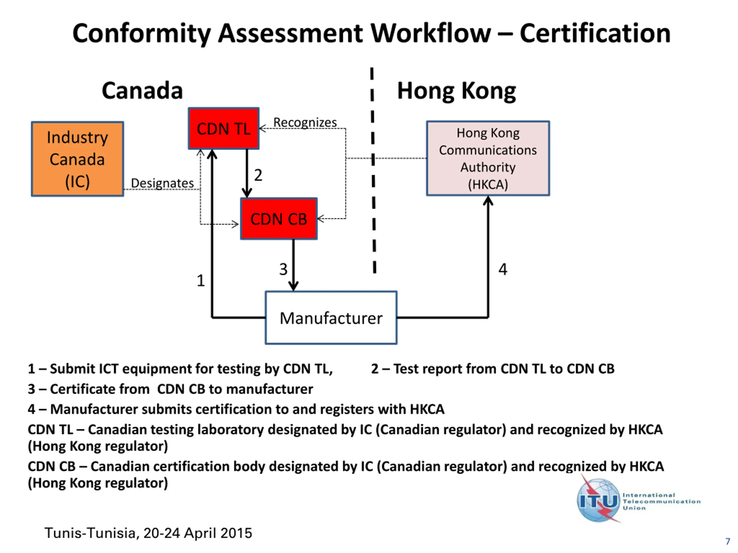 Conformity Assessment Workflow Certification Canada Hong Kong Recognizes CDN TL Hong Kong Communications Authority (HKCA) Industry Canada (IC) 2 Designates CDN CB 3 1 Manufacturer 1 Submit ICT equipment for testing by CDN TL, 2 Test report from CDN TL to CDN CB 3 Certificate from CDN CB to manufacturer CDN TL Canadian testing laboratory designated by IC (Canadian regulator) and recognized by HKCA (Hong Kong regulator) CDN CB Canadian certification body designated by IC (Canadian regulator) and recognized by HKCA (Hong Kong regulator) Tunis-Tunisia, 20-24 April 2015 6