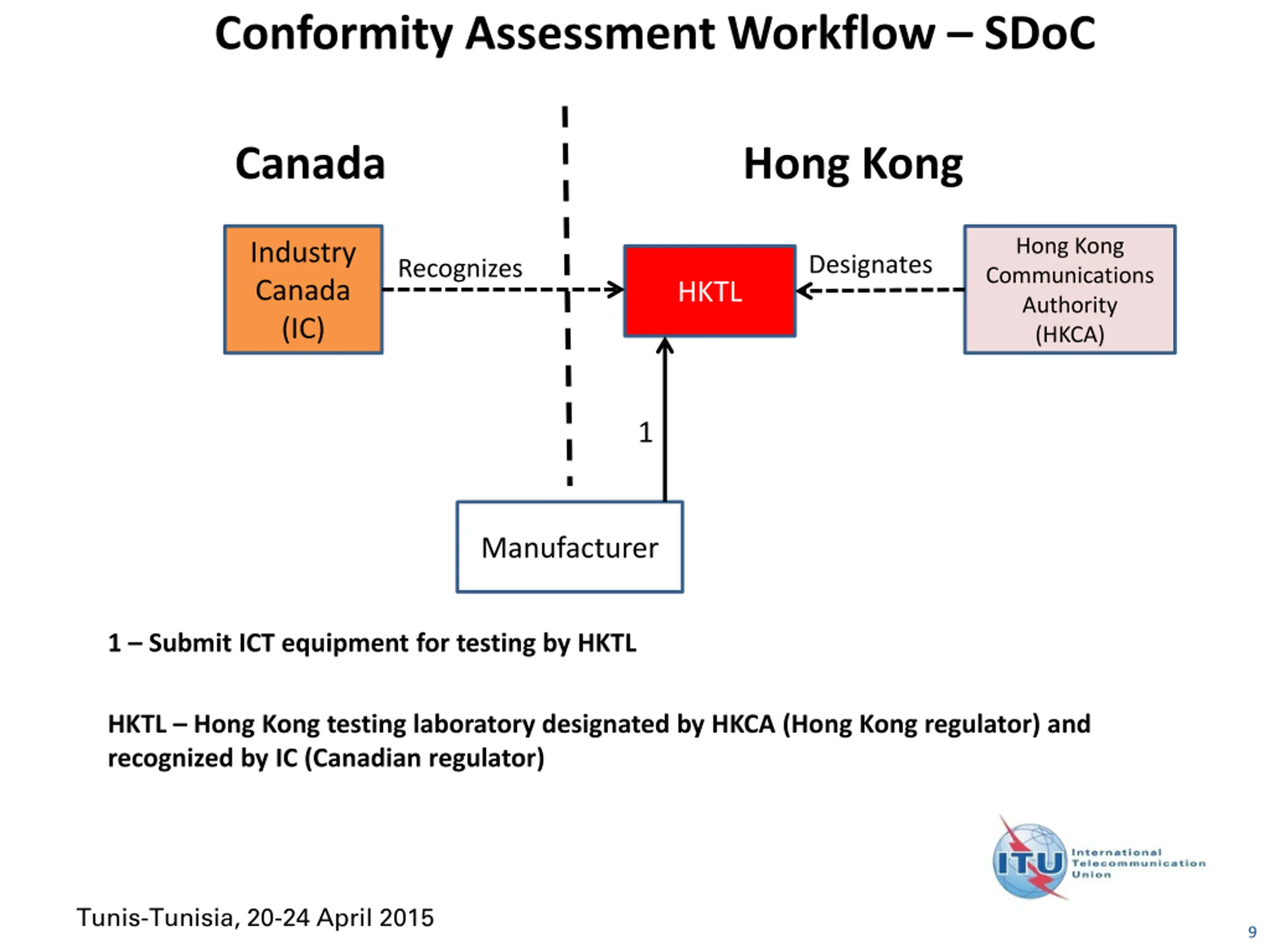 Conformity Assessment Workflow SDoC Canada Hong Kong Hong Kong Communications Authority (HKCA) Industry Canada (IC) Designates Recognizes HKTL Manufacturer HKTL Hong Kong testing laboratory designated by HKCA (Hong Kong regulator) and recognized by IC (Canadian regulator) Tunis-Tunisia, 20-24 April 2015 8