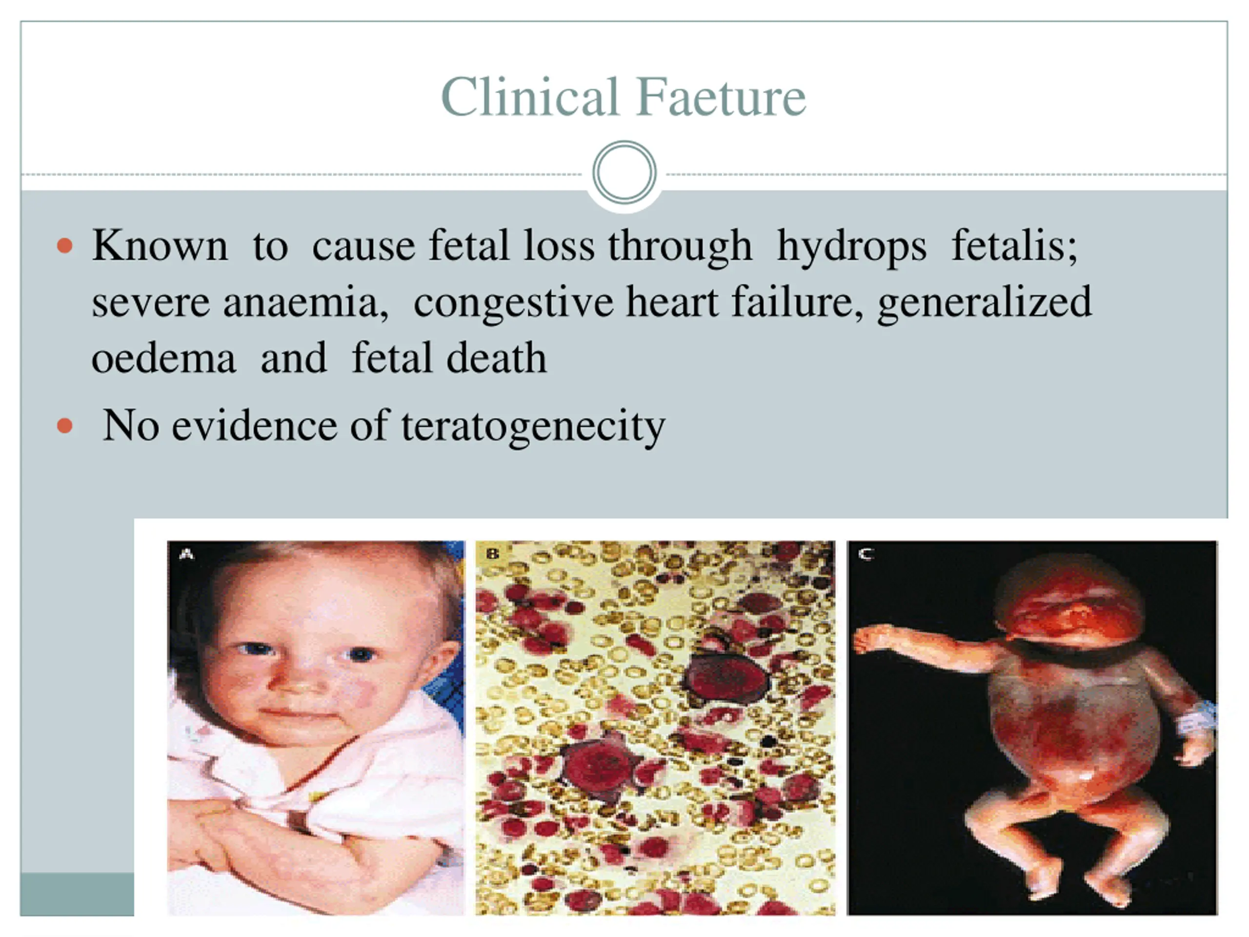 Clinical Faeture Known to cause fetal loss through hydrops fetalis; severe anaemia, congestive heart failure, generalized oedema and fetal death No evidence of teratogenecity