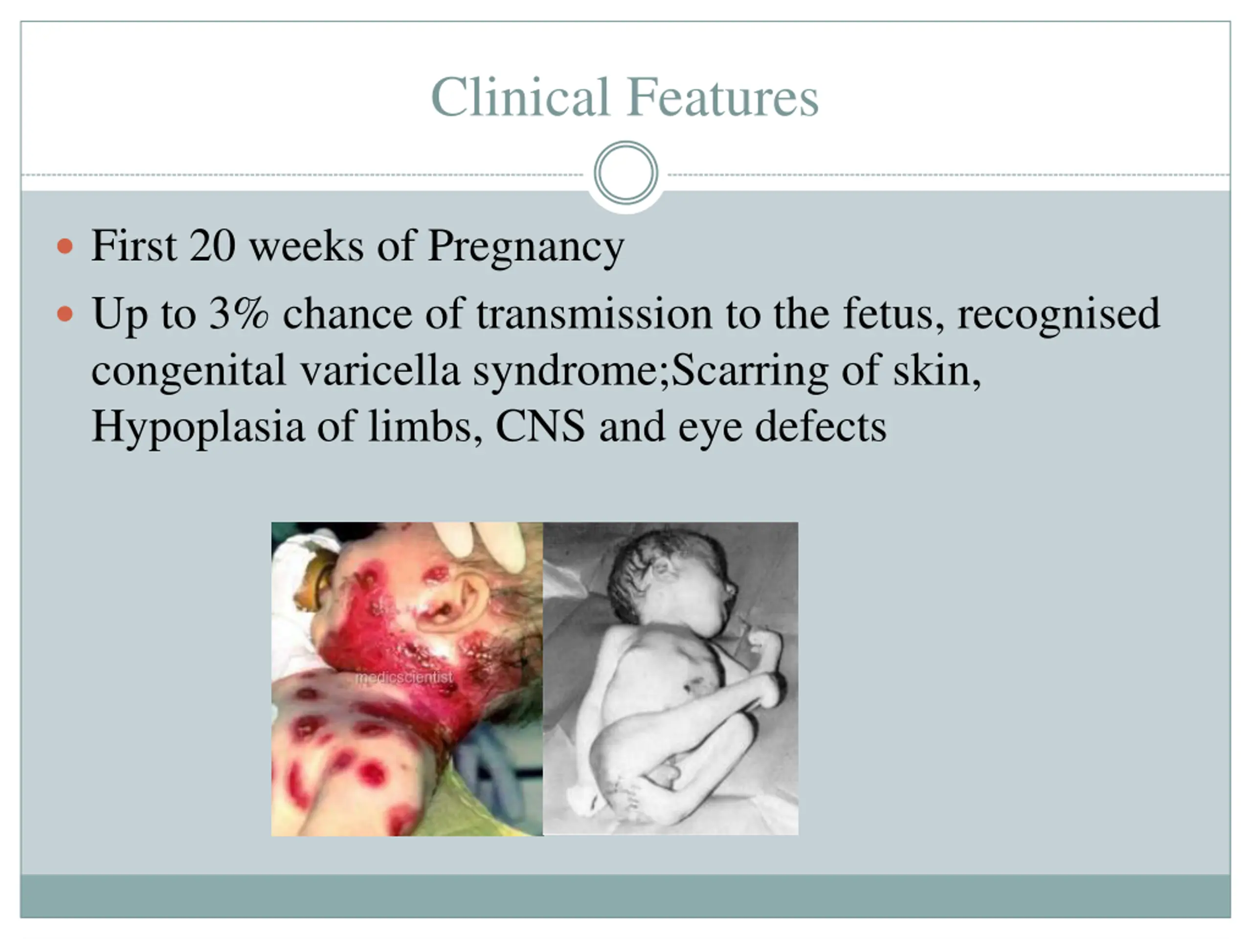 Clinical Features First 20 weeks of Pregnancy Up to 3% chance of transmission to the fetus, recognised congenital varicella syndrome;Scarring of skin, Hypoplasia of limbs, CNS and eye defects