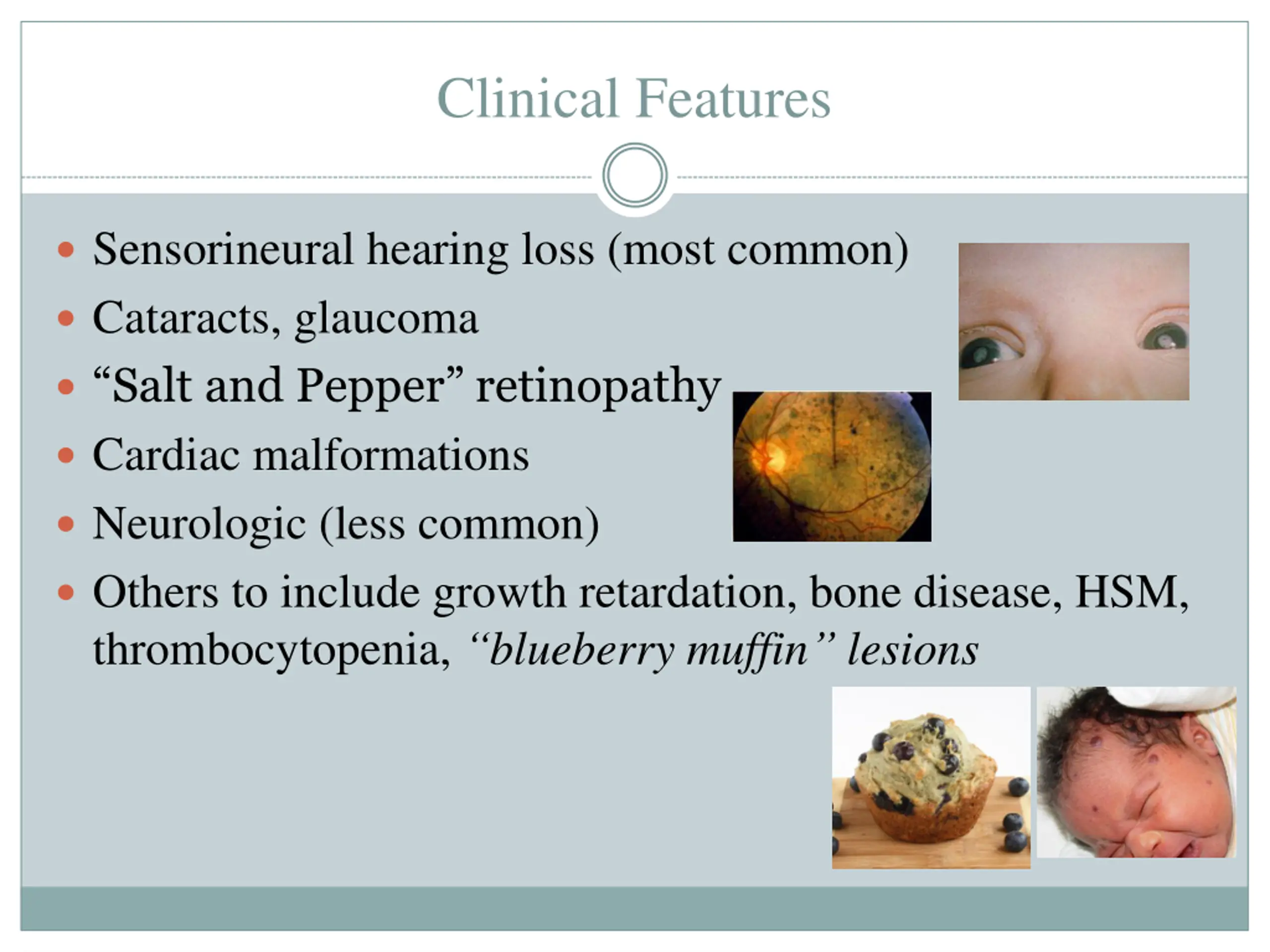 Clinical Features Sensorineural hearing loss (most common) Cataracts, glaucoma Salt and Pepper retinopathy Cardiac malformations Neurologic (less common) Others to include growth retardation, bone disease, HSM, thrombocytopenia, blueberry muffin lesions