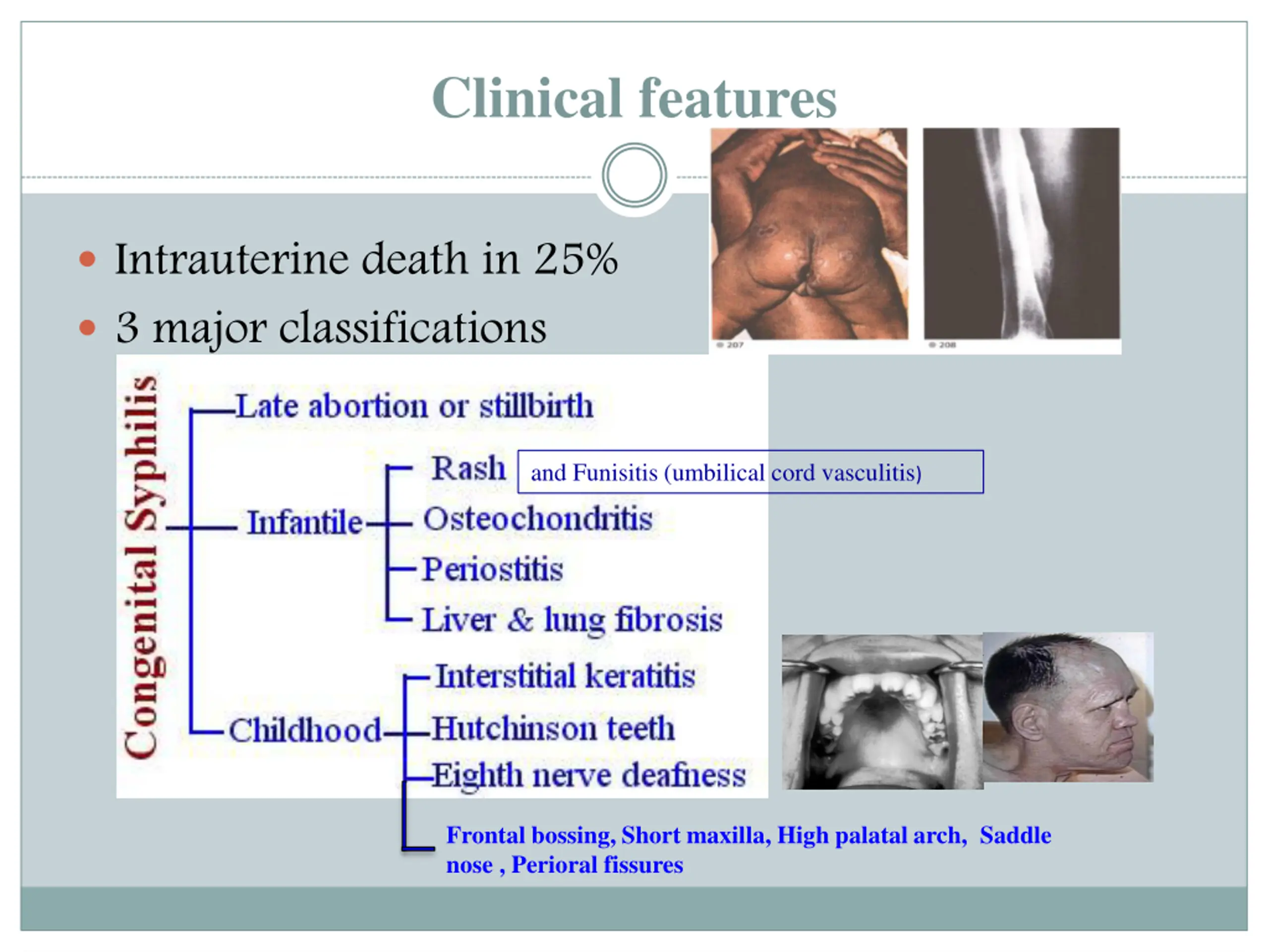 Clinical features Intrauterine death in 25% 3 major classifications and Funisitis (umbilical cord vasculitis) Frontal bossing, Short maxilla, High palatal arch, Saddle nose , Perioral fissures