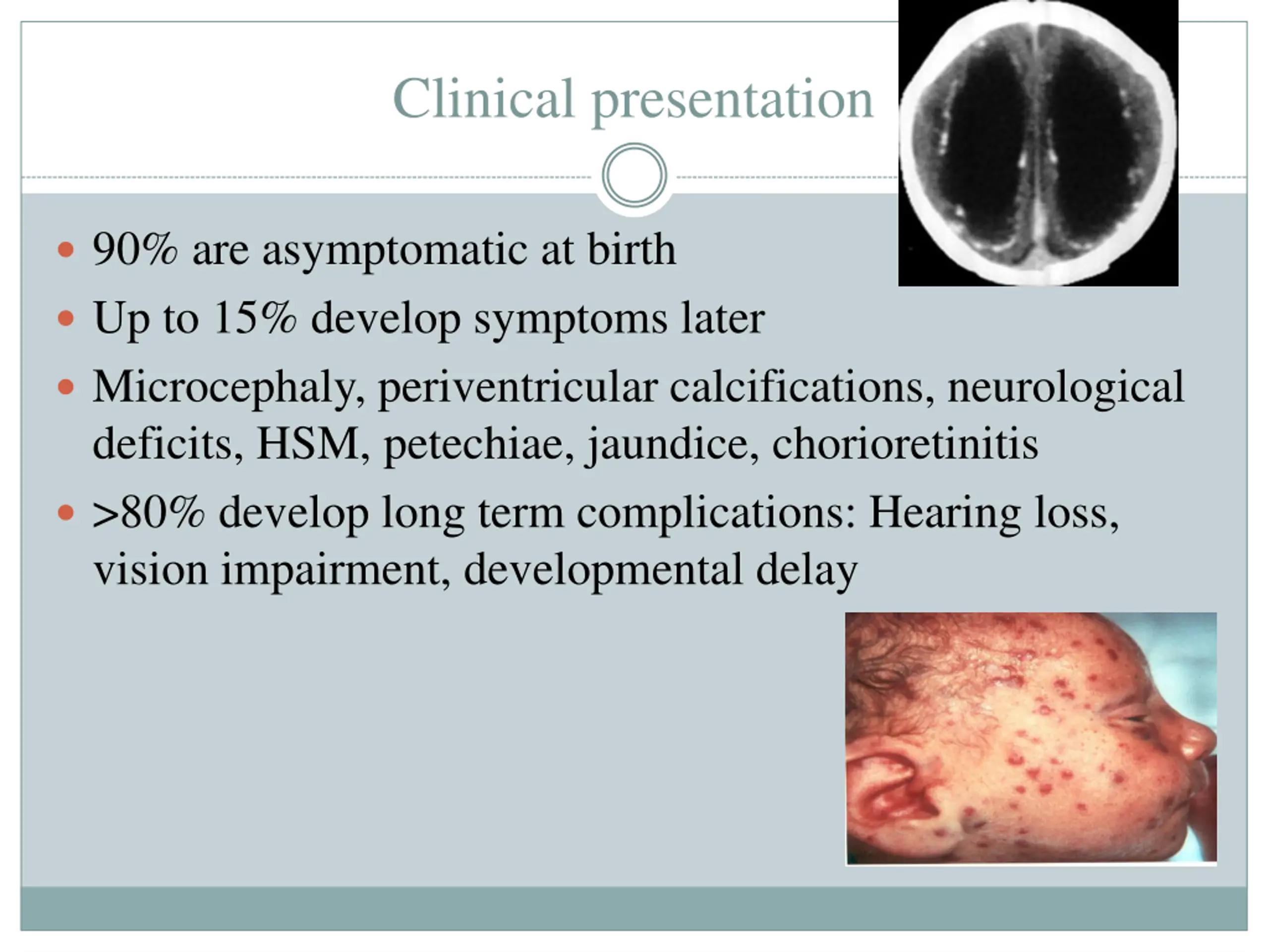 Clinical presentation 90% are asymptomatic at birth Up to 15% develop symptoms later Microcephaly, periventricular calcifications, neurological deficits, HSM, petechiae, jaundice, chorioretinitis >80% develop long term complications: Hearing loss, vision impairment, developmental delay