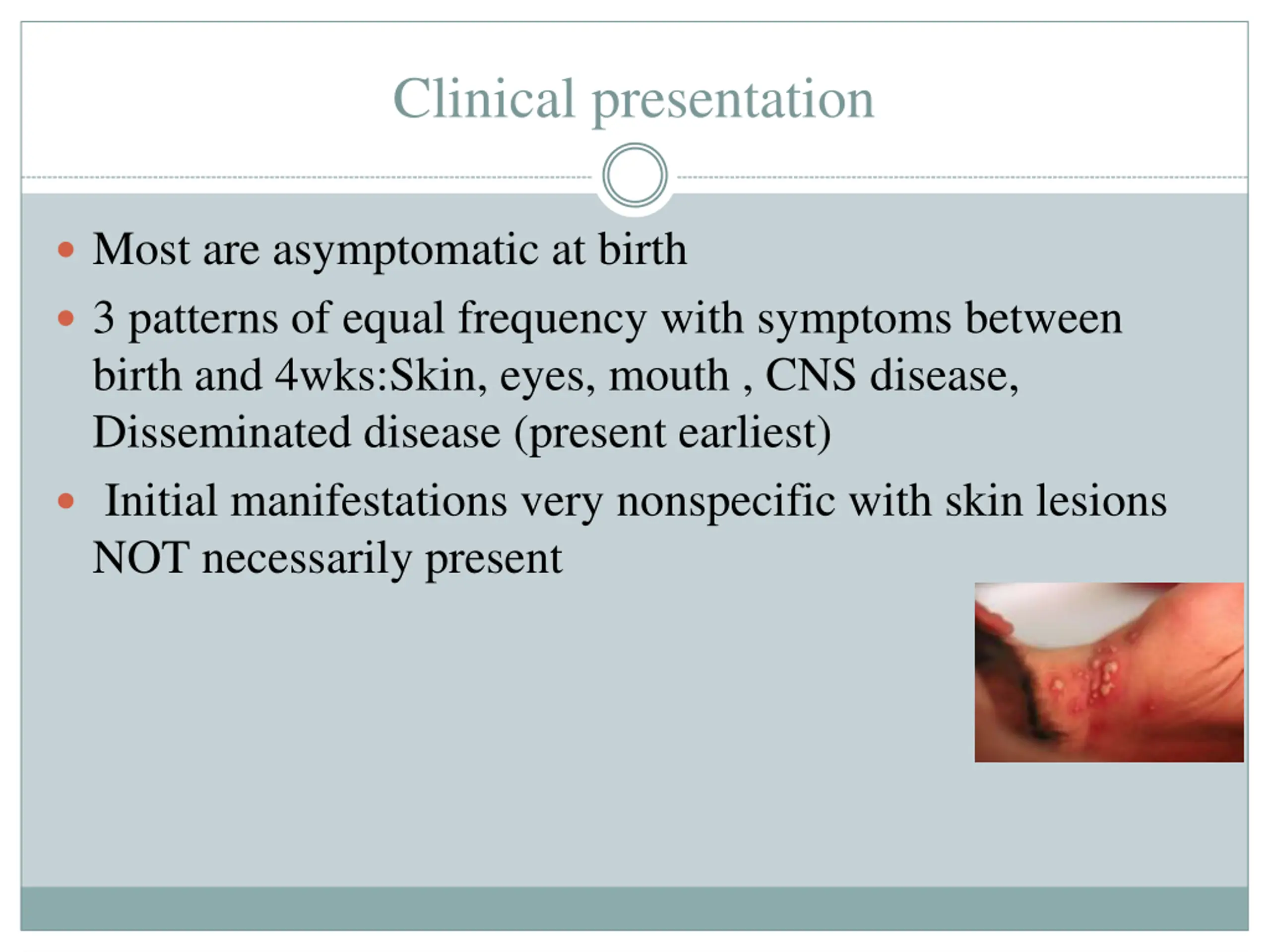 Clinical presentation Most are asymptomatic at birth 3 patterns of equal frequency with symptoms between birth and 4wks:Skin, eyes, mouth , CNS disease, Disseminated disease (present earliest) Initial manifestations very nonspecific with skin lesions NOT necessarily present