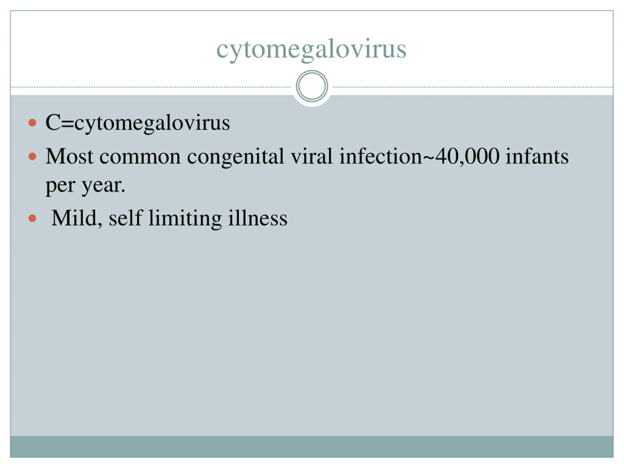 cytomegalovirus C=cytomegalovirus Most common congenital viral infection~40,000 infants per year. Mild, self limiting illness