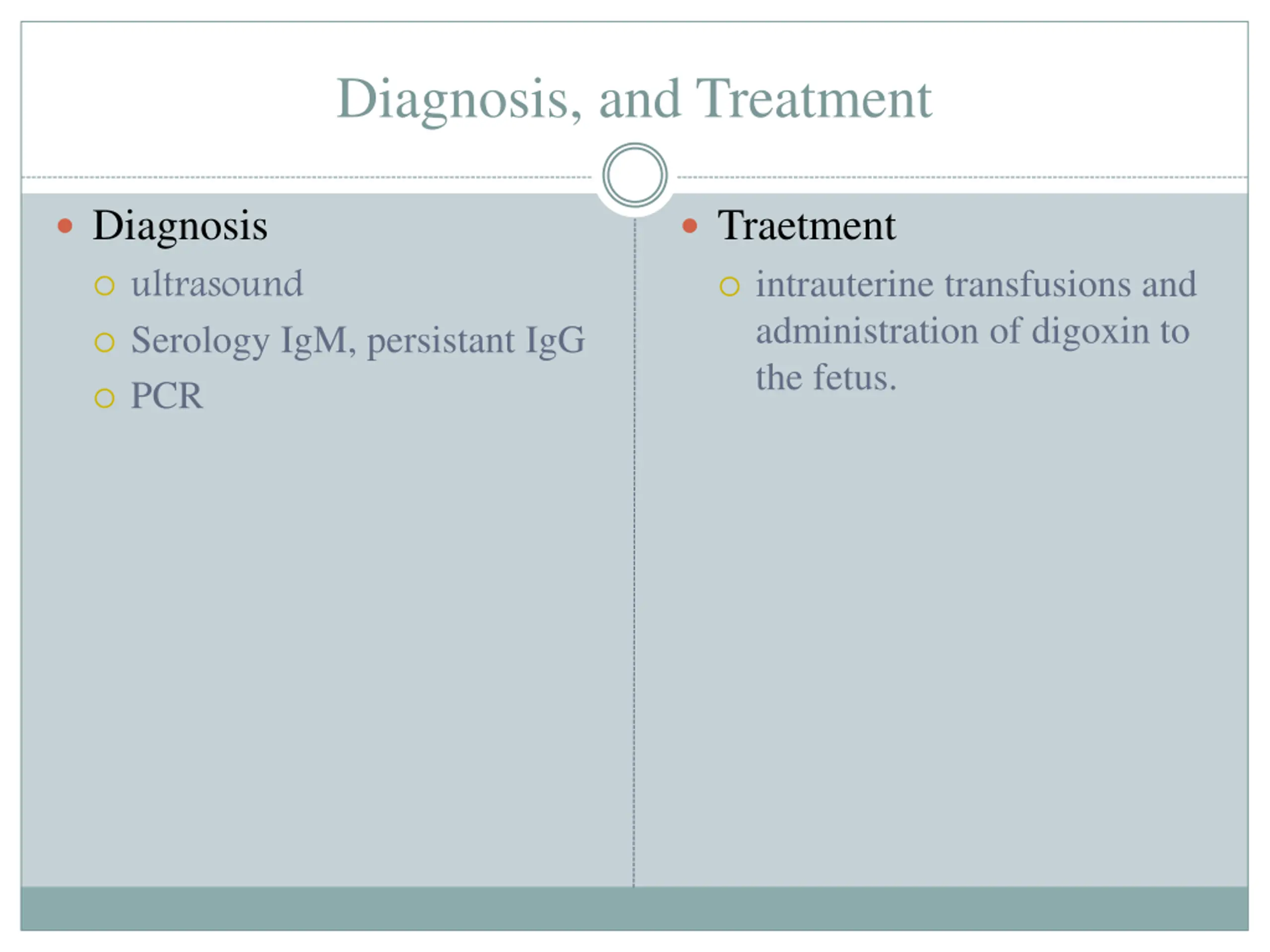 Diagnosis, and Treatment Diagnosis Traetment intrauterine transfusions and administration of digoxin to the fetus. ultrasound Serology IgM, persistant IgG PCR