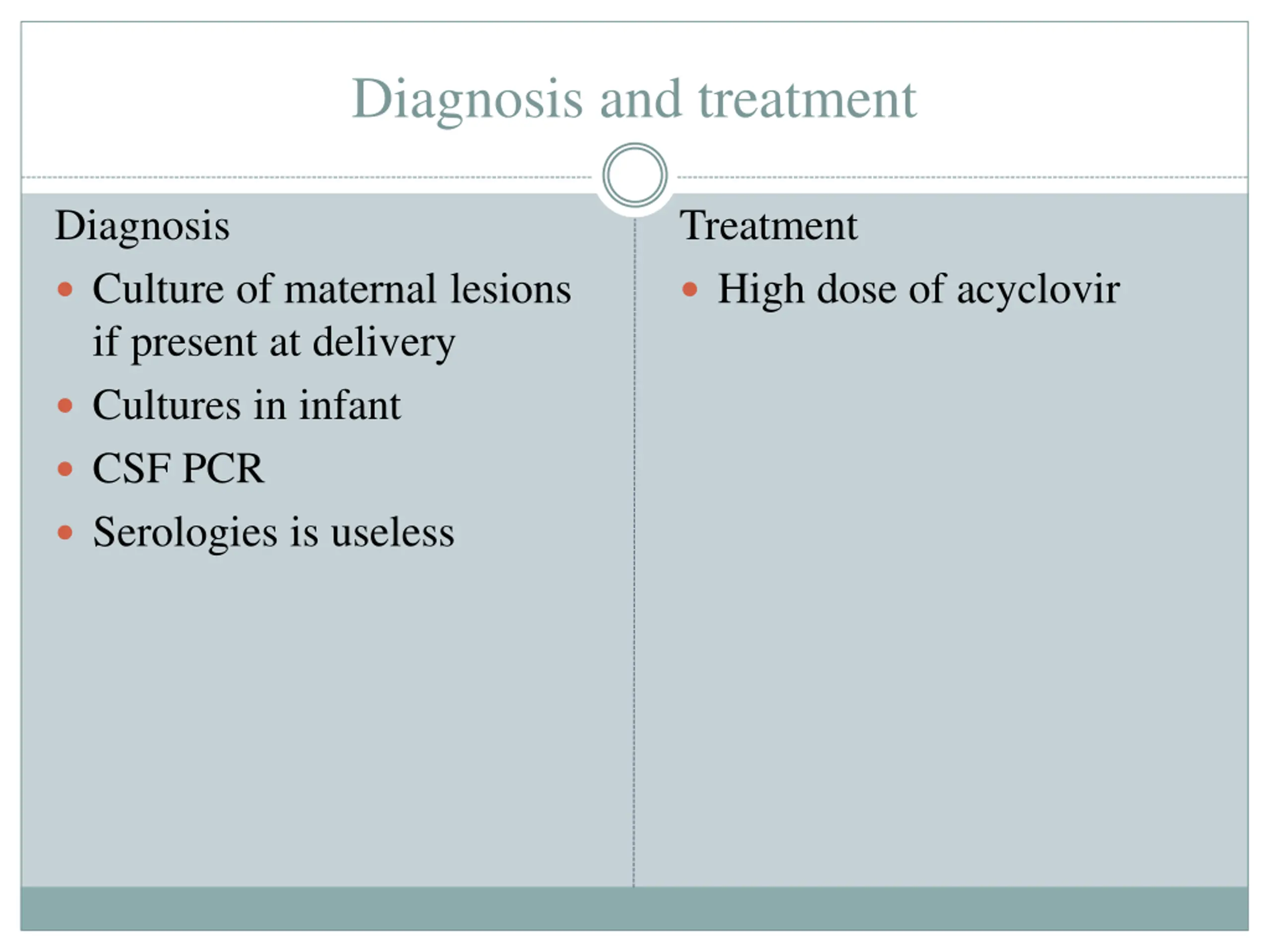 Diagnosis and treatment Diagnosis Culture of maternal lesions if present at delivery Cultures in infant CSF PCR Serologies is useless Treatment High dose of acyclovir