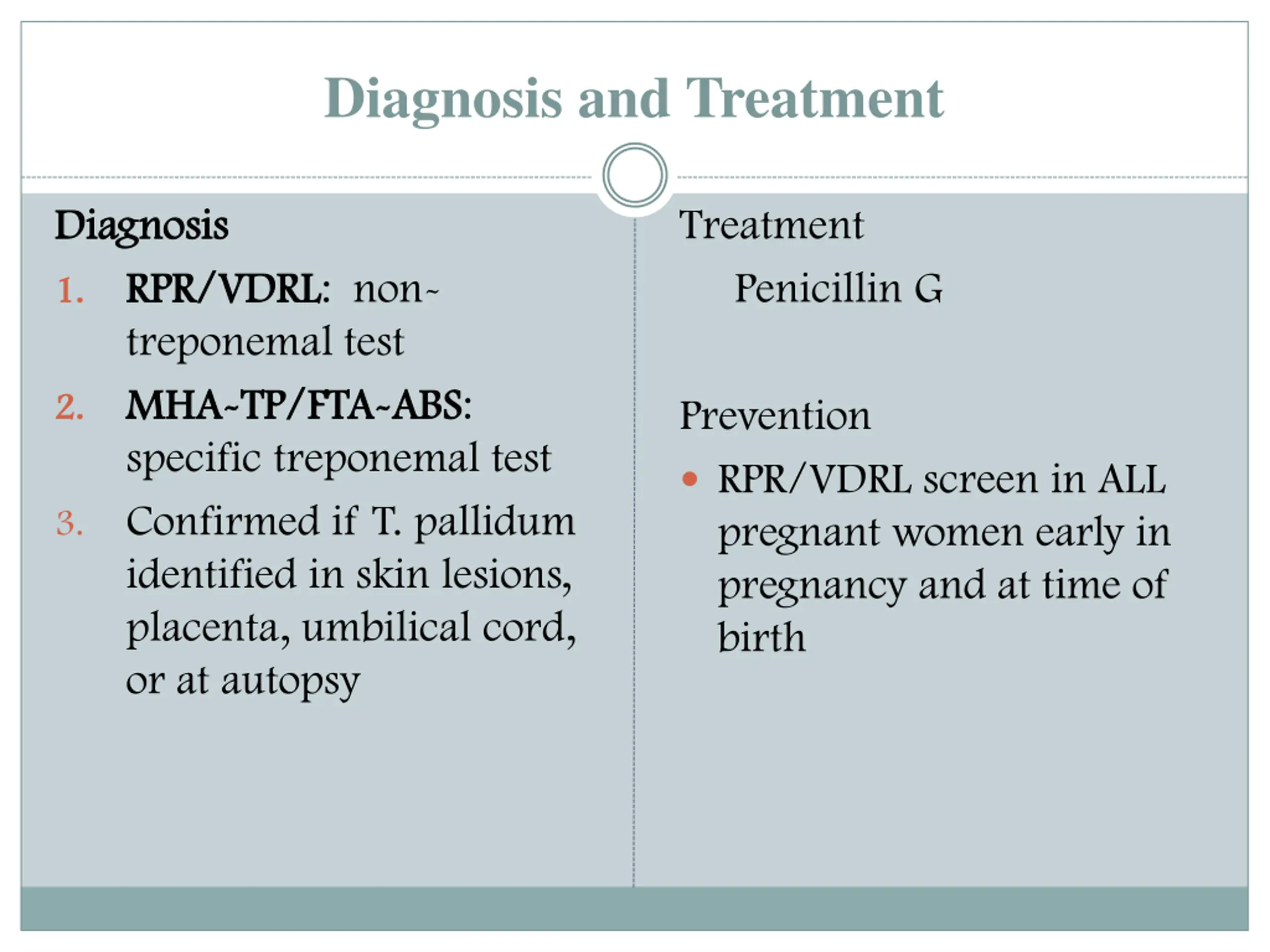 Diagnosis and Treatment Diagnosis Diagnosis Treatment RPR/VDRL RPR/VDRL: non- treponemal test Penicillin G 1. 1. MHA MHA- -TP/FTA TP/FTA- -ABS specific treponemal test ABS: 2. 2. Prevention RPR/VDRL screen in ALL pregnant women early in pregnancy and at time of birth Confirmed if T. pallidum identified in skin lesions, placenta, umbilical cord, or at autopsy 3.
