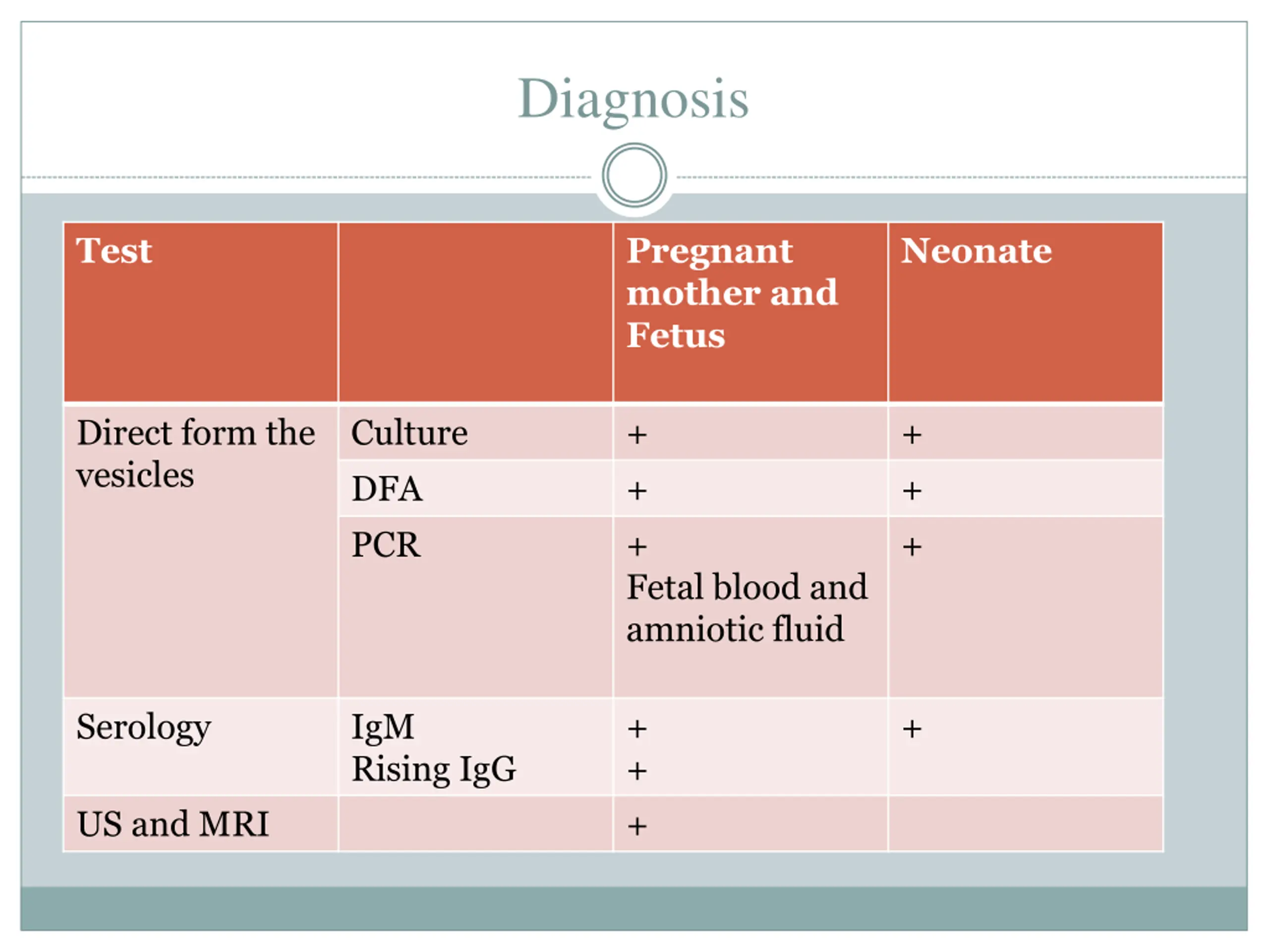 Diagnosis Test Pregnant mother and Fetus Neonate Direct form the vesicles Culture DFA PCR + + + Fetal blood and amniotic fluid + + + Serology IgM Rising IgG + + + + US and MRI