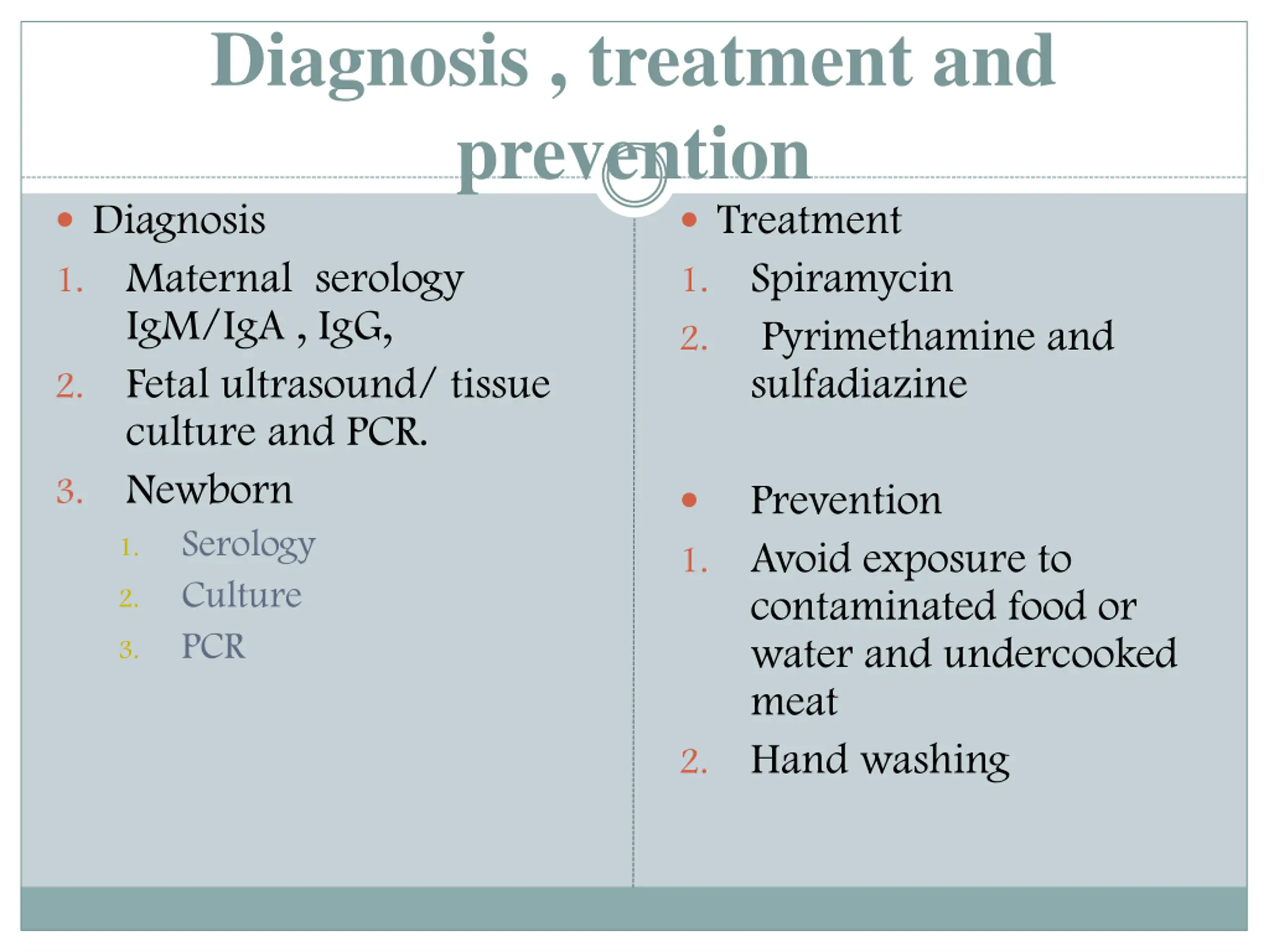 Diagnosis , treatment and prevention Diagnosis Maternal serology IgM/IgA , IgG, Fetal ultrasound/ tissue culture and PCR. Newborn Serology Culture PCR Treatment Spiramycin Pyrimethamine and sulfadiazine 1. 1. 2. 2. 3. Prevention Avoid exposure to contaminated food or water and undercooked meat Hand washing 1. 1. 2. 3. 2.