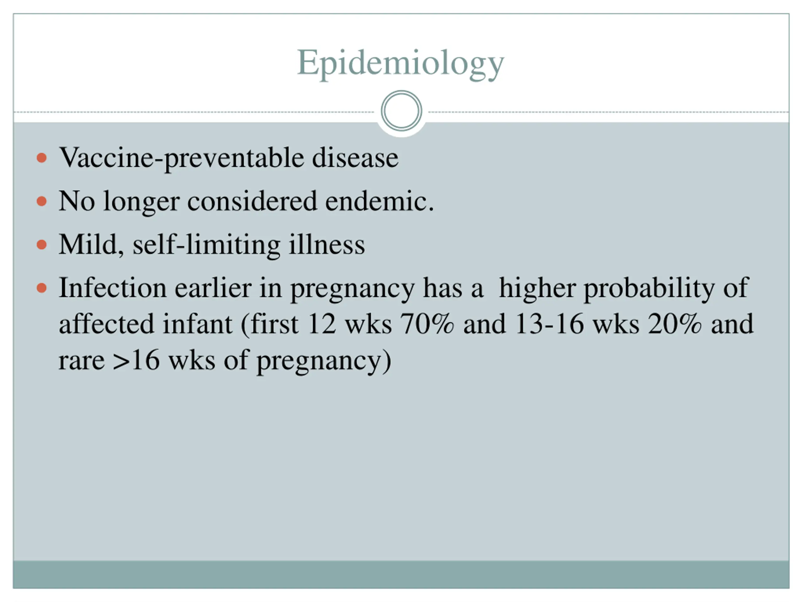 Epidemiology Vaccine-preventable disease No longer considered endemic. Mild, self-limiting illness Infection earlier in pregnancy has a higher probability of affected infant (first 12 wks 70% and 13-16 wks 20% and rare >16 wks of pregnancy)