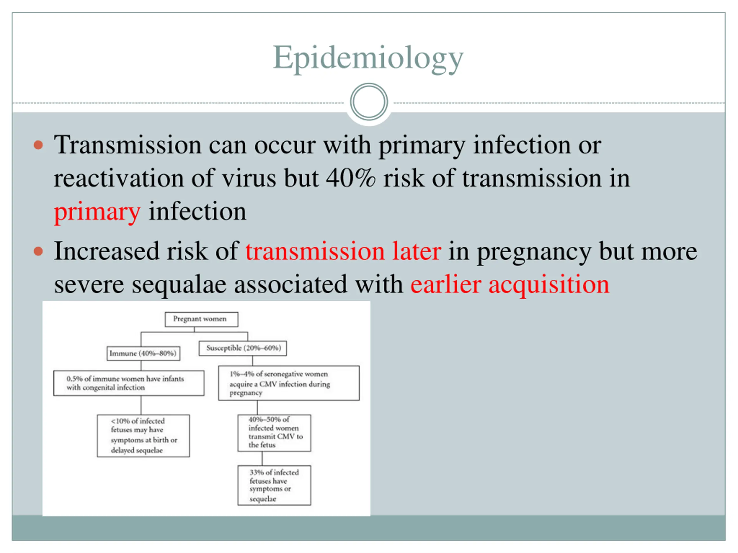 Epidemiology Transmission can occur with primary infection or reactivation of virus but 40% risk of transmission in primary infection Increased risk of transmission later in pregnancy but more severe sequalae associated with earlier acquisition