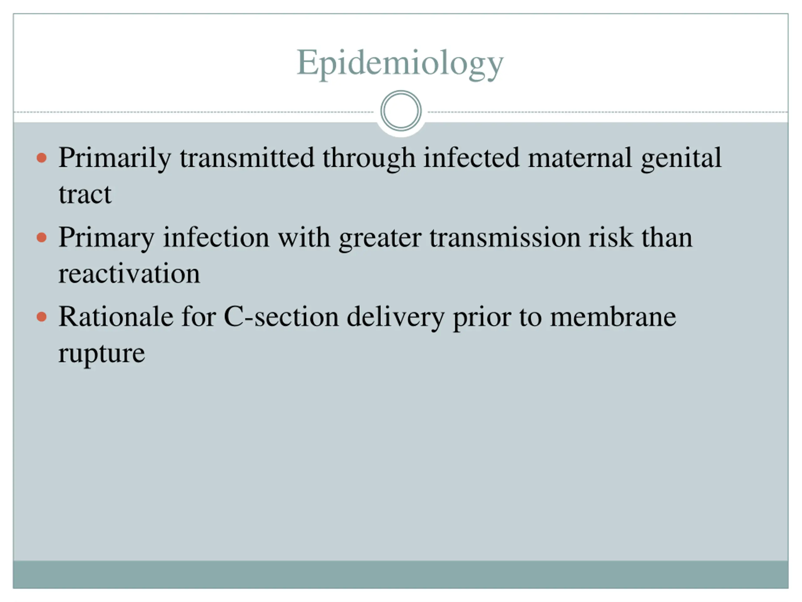 Epidemiology Primarily transmitted through infected maternal genital tract Primary infection with greater transmission risk than reactivation Rationale for C-section delivery prior to membrane rupture
