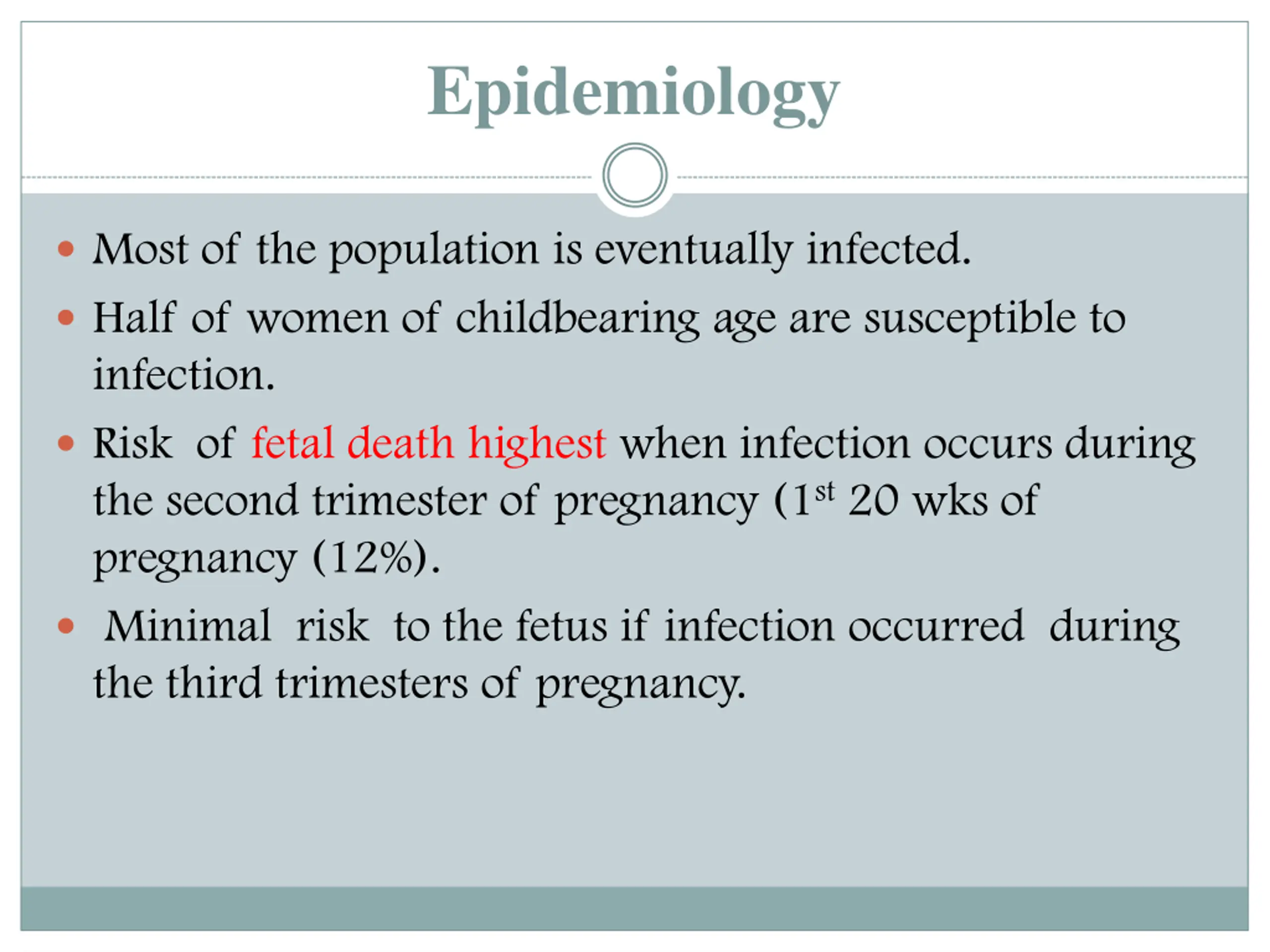 Epidemiology Most of the population is eventually infected. Half of women of childbearing age are susceptible to infection. Risk of fetal death highest when infection occurs during the second trimester of pregnancy (1st 20 wks of pregnancy (12%). Minimal risk to the fetus if infection occurred during the third trimesters of pregnancy.