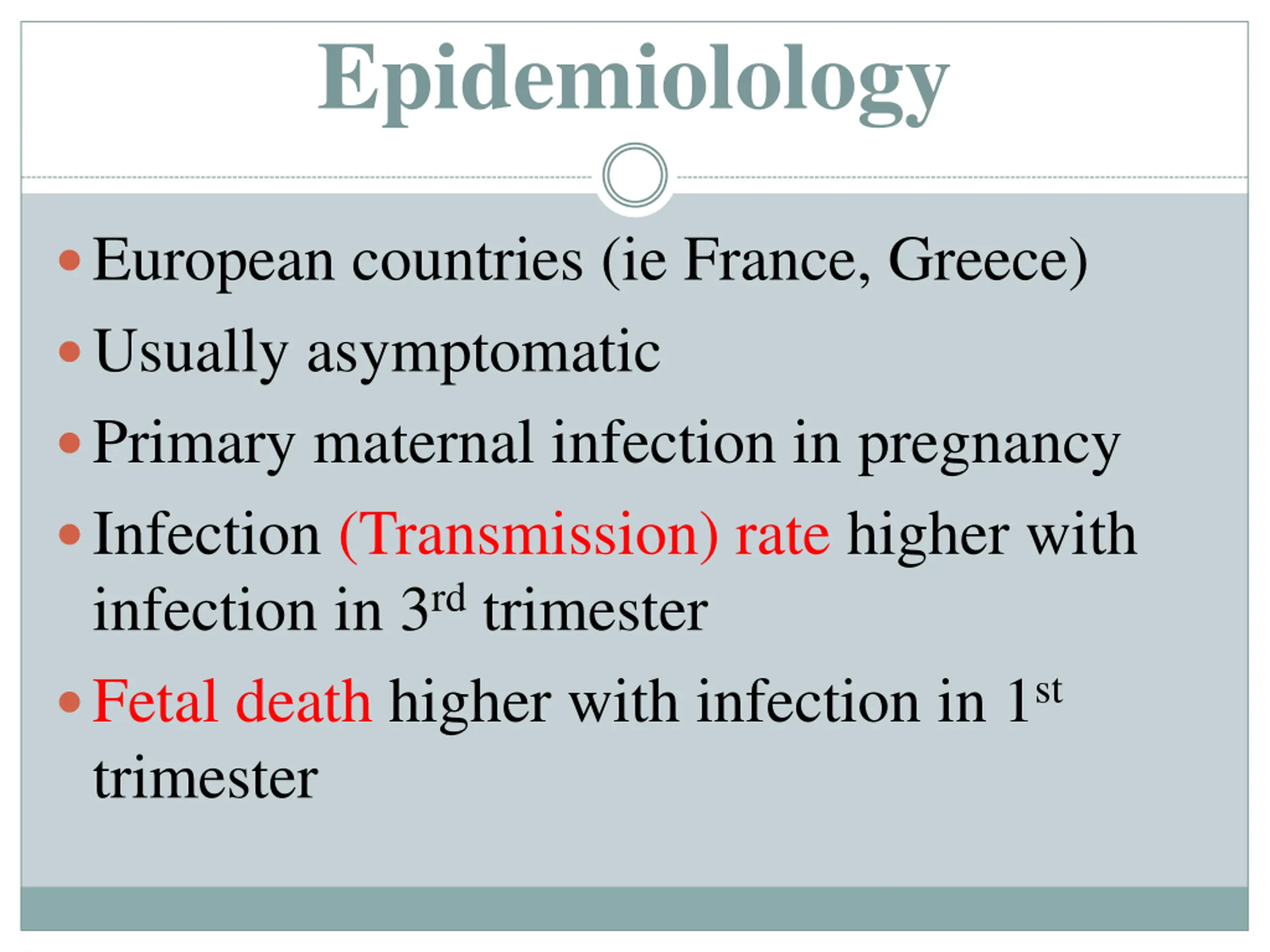 Epidemiolology European countries (ie France, Greece) Usually asymptomatic Primary maternal infection in pregnancy Infection (Transmission) rate higher with infection in 3rdtrimester Fetal death higher with infection in 1st trimester
