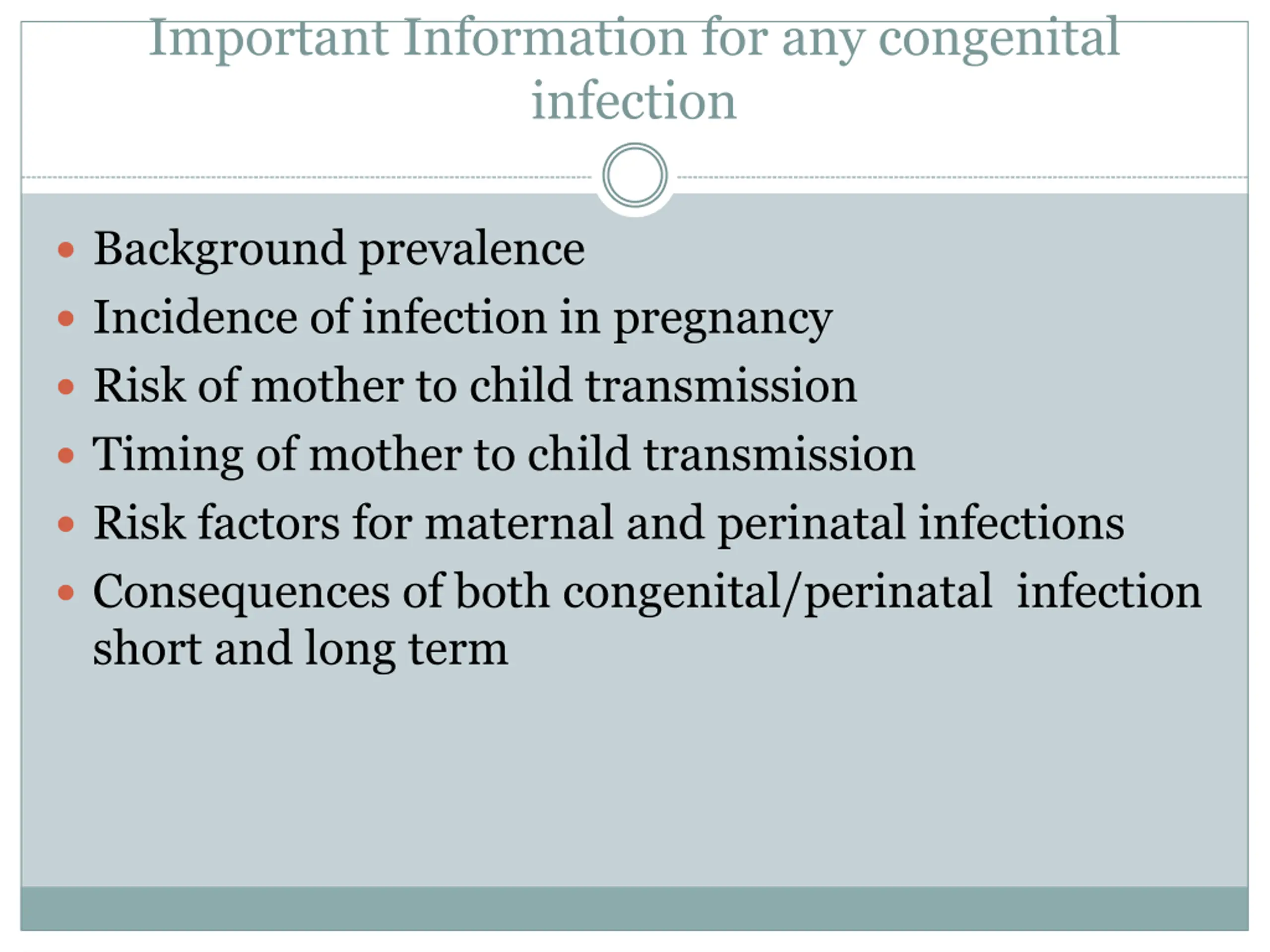 Important Information for any congenital infection Background prevalence Incidence of infection in pregnancy Risk of mother to child transmission Timing of mother to child transmission Risk factors for maternal and perinatal infections Consequences of both congenital/perinatal infection short and long term