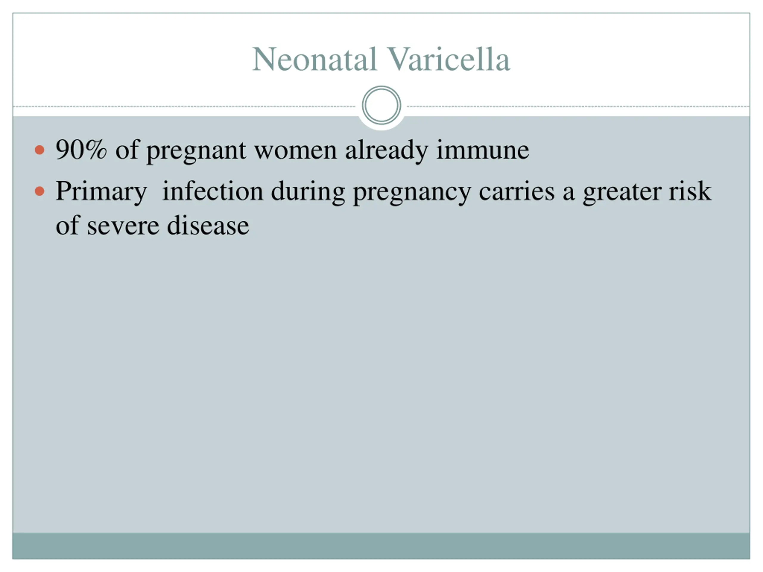 Neonatal Varicella 90% of pregnant women already immune Primary infection during pregnancy carries a greater risk of severe disease