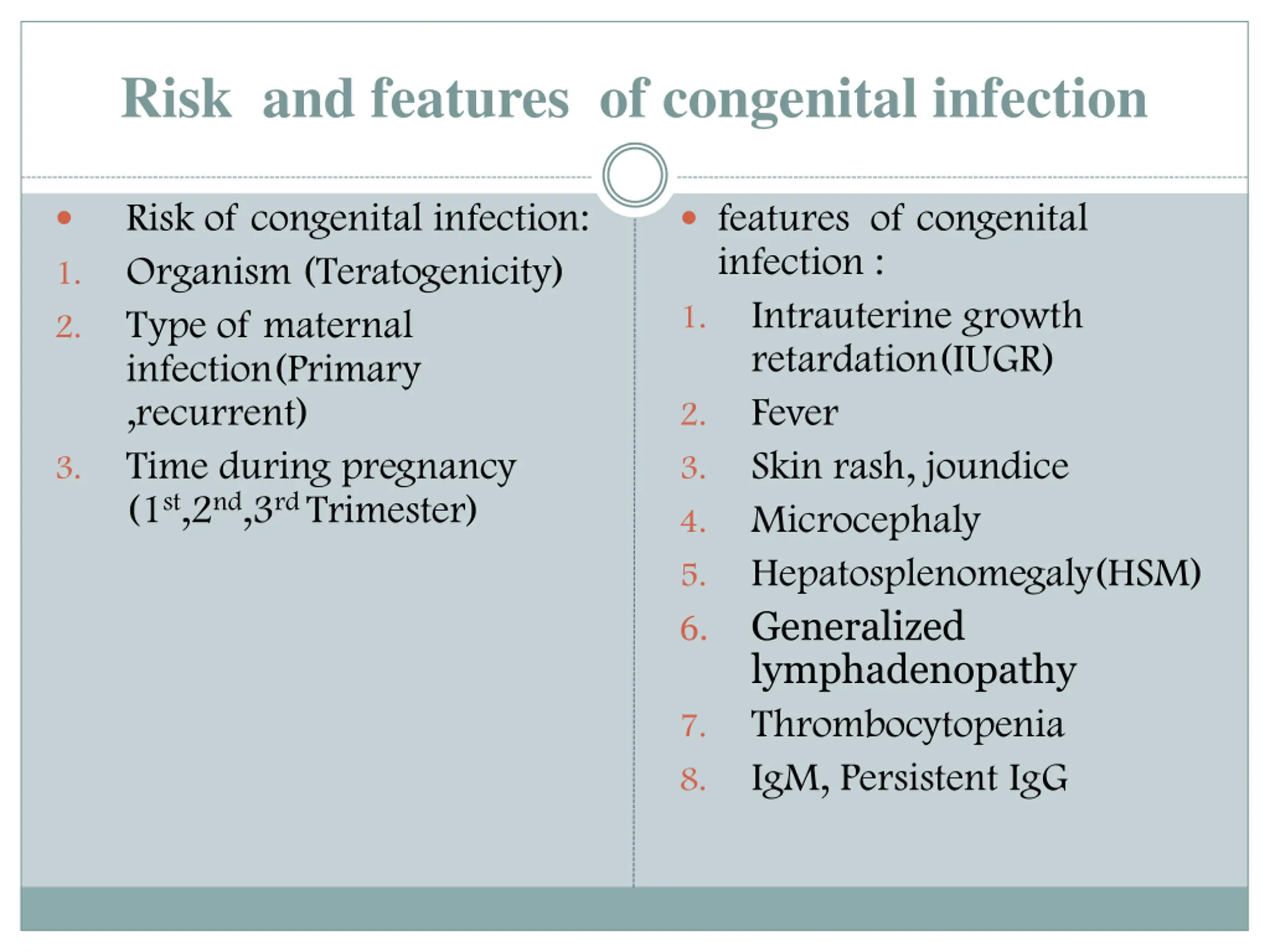 Risk and features of congenital infection features of congenital infection : Intrauterine growth retardation(IUGR) Fever Skin rash, joundice Microcephaly Hepatosplenomegaly(HSM) 6. Generalized lymphadenopathy Thrombocytopenia IgM, Persistent IgG Risk of congenital infection: Organism (Teratogenicity) Type of maternal infection(Primary ,recurrent) Time during pregnancy (1st,2nd,3rd Trimester) 1. 1. 2. 2. 3. 3. 4. 5. 7. 8.