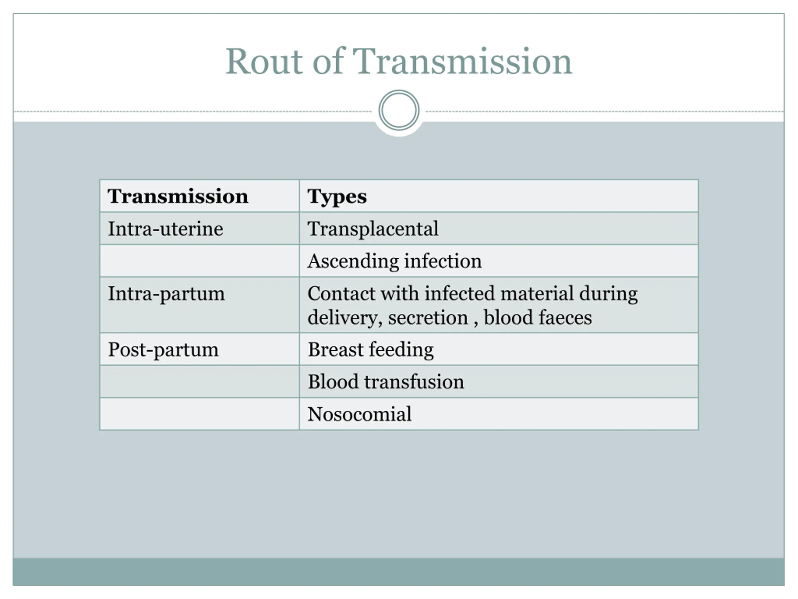 Rout of Transmission Transmission Intra-uterine Types Transplacental Ascending infection Contact with infected material during delivery, secretion , blood faeces Breast feeding Blood transfusion Nosocomial Intra-partum Post-partum
