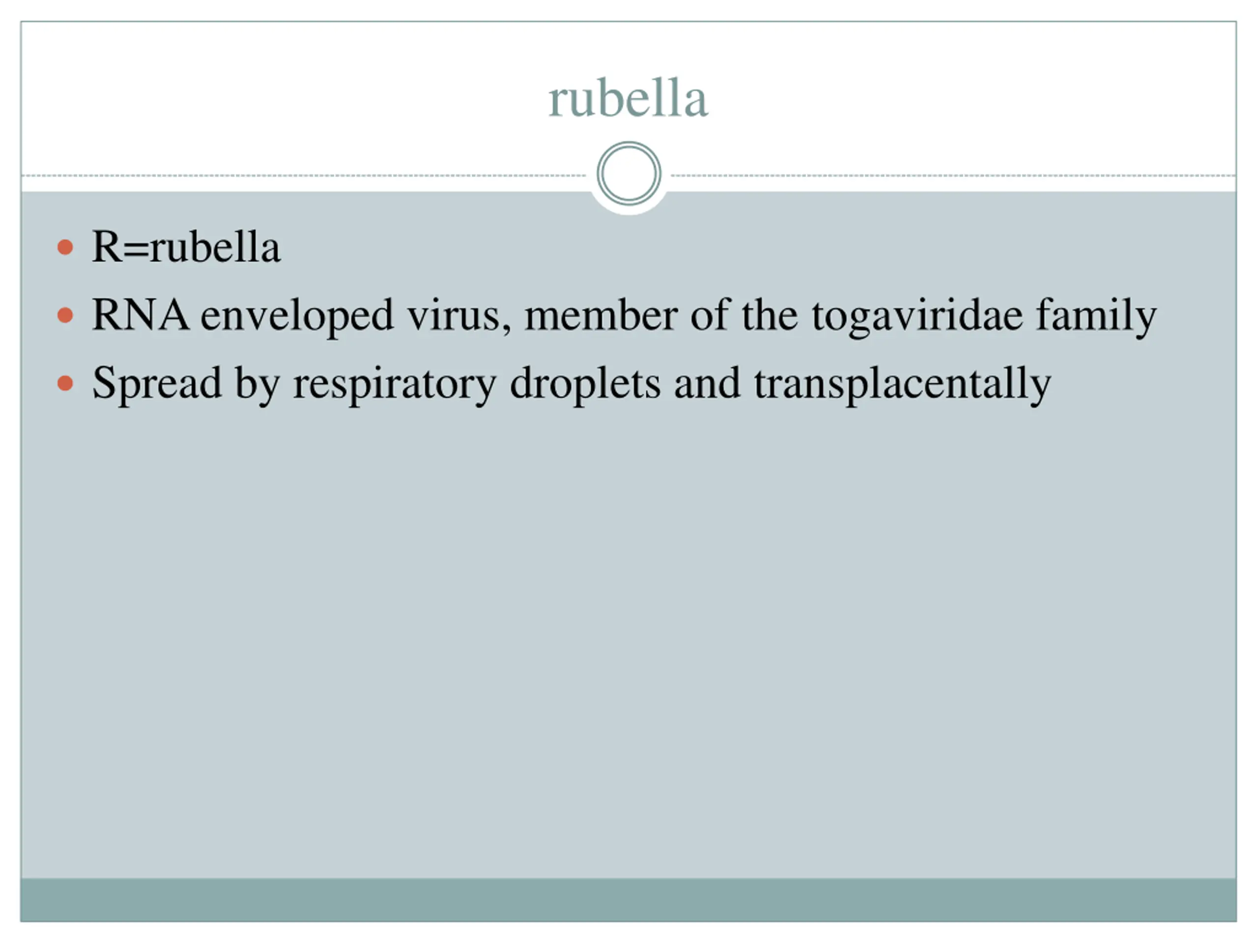rubella R=rubella RNA enveloped virus, member of the togaviridae family Spread by respiratory droplets and transplacentally